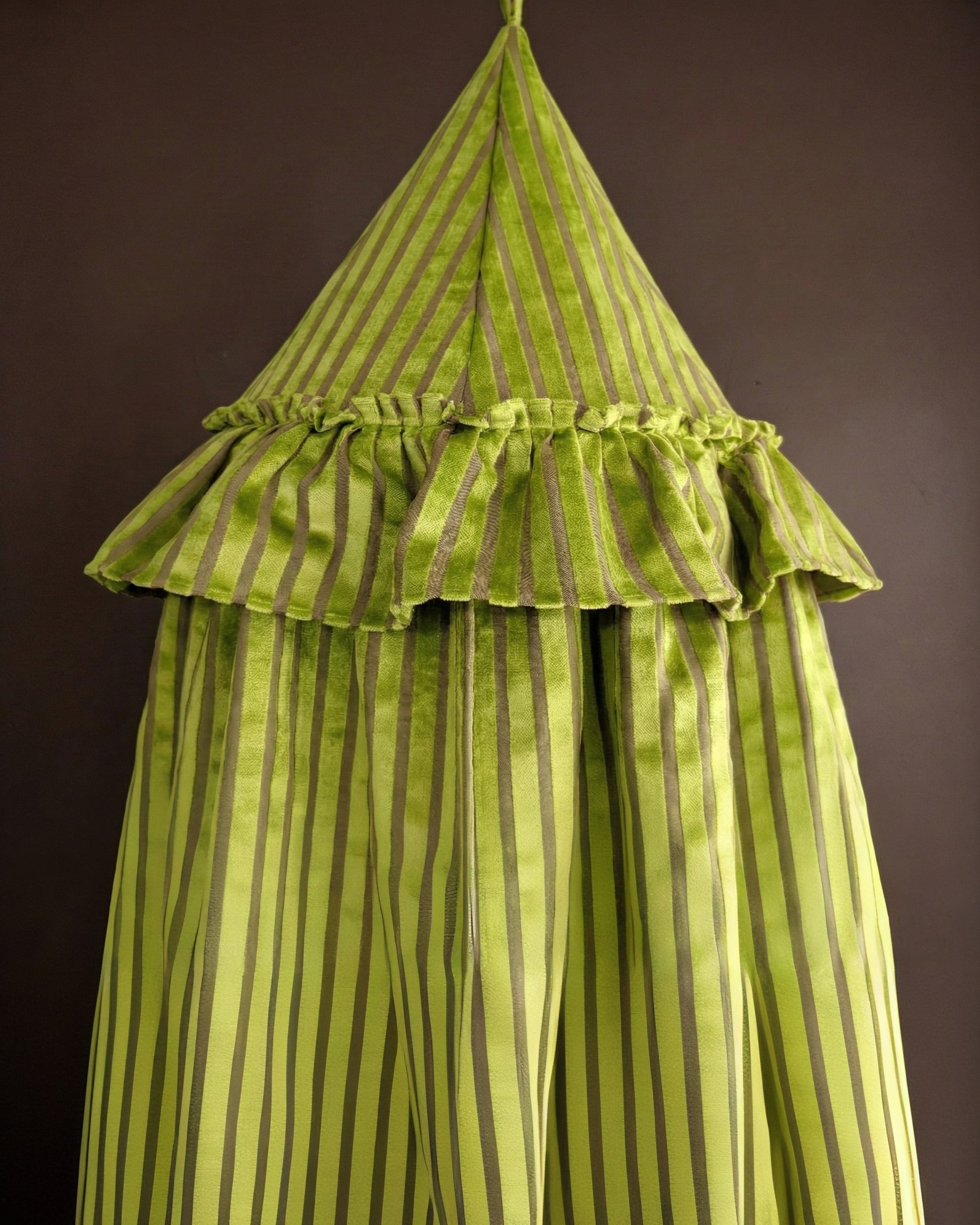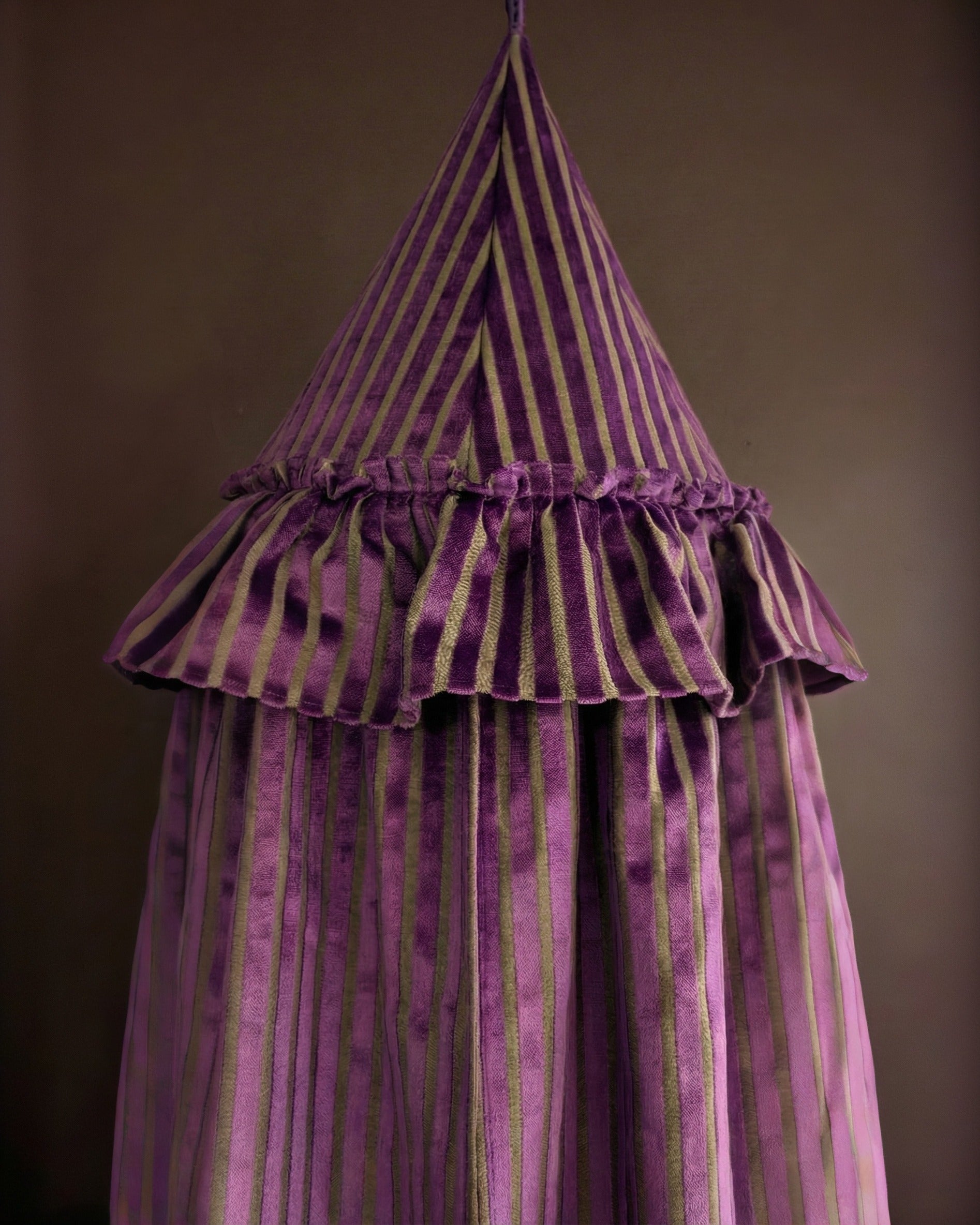 Create a regal retreat in any room with this stunning velvet corner canopy. Crafted from sumptuous pink velvet, this elegant canopy drapes gracefully from the ceiling to the floor, transforming an ordinary corner into a cozy and sophisticated sanctuary. The rich fabric features subtle vertical striping and is adorned with a plush, gathered ruffle trim at the top, adding a touch of opulence. Perfect for a reading nook, a child's play area, or a dramatic bedroom accent, it instantly elevates your decor with its warm color and luxurious texture. Pair it with plush cushions and rugs to complete the inviting scene.