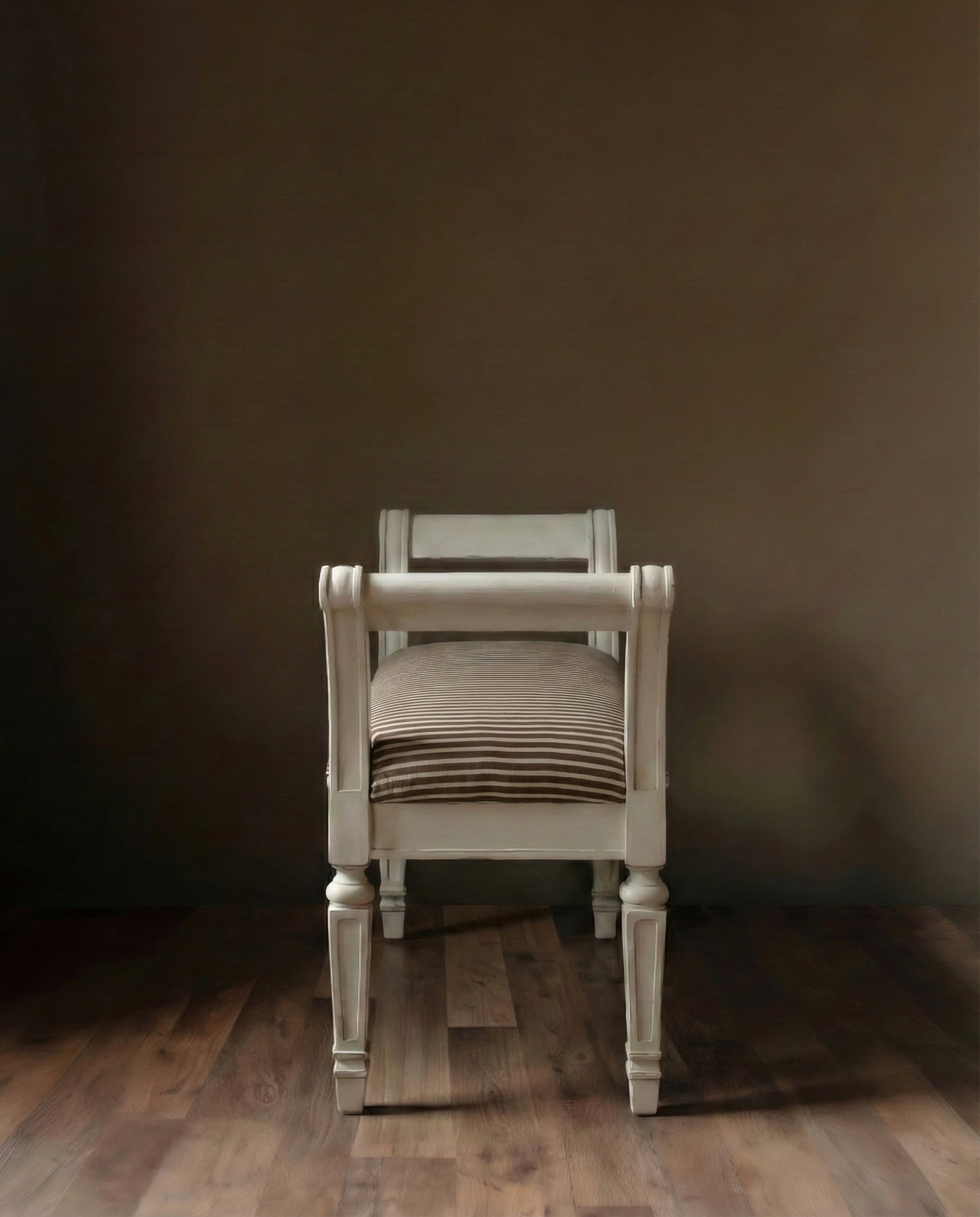 The sturdy wooden frame is finished in a distressed antique white, highlighting the graceful curves of the rolled arms and the intricate carved details along the apron. It rests on four substantial, fluted turned legs that provide vintage appeal. The true highlight, however, is the generously padded seat, upholstered in sumptuous Belgian linen velvet. This high-end fabric, featuring a classic mink, aqua, fuchsia and sage stripe, offers an incredibly soft hand, a rich pile, and a sophisticated matte sheen that invites you to touch.