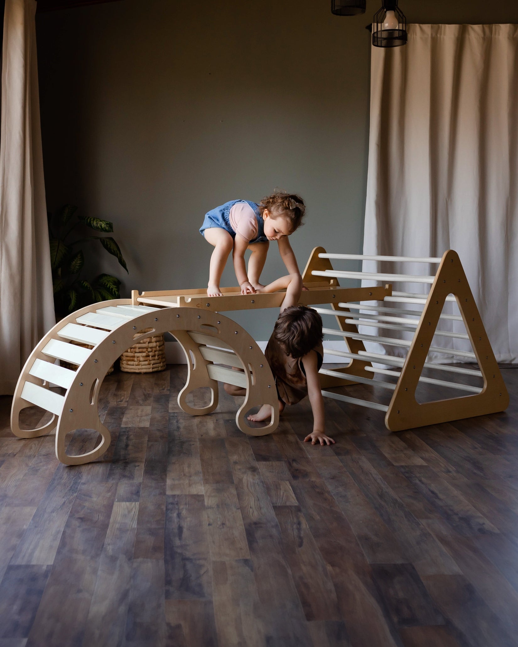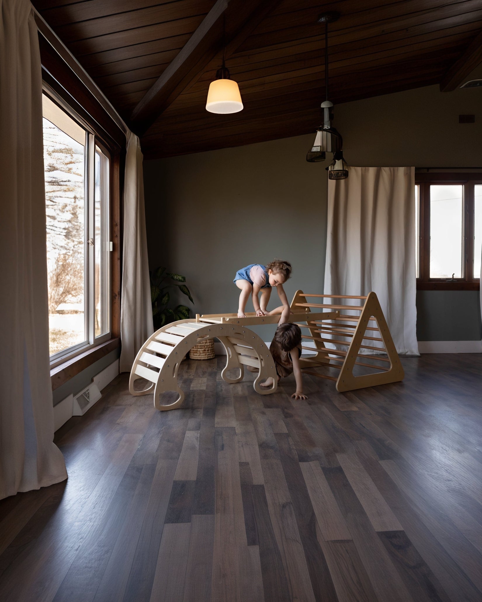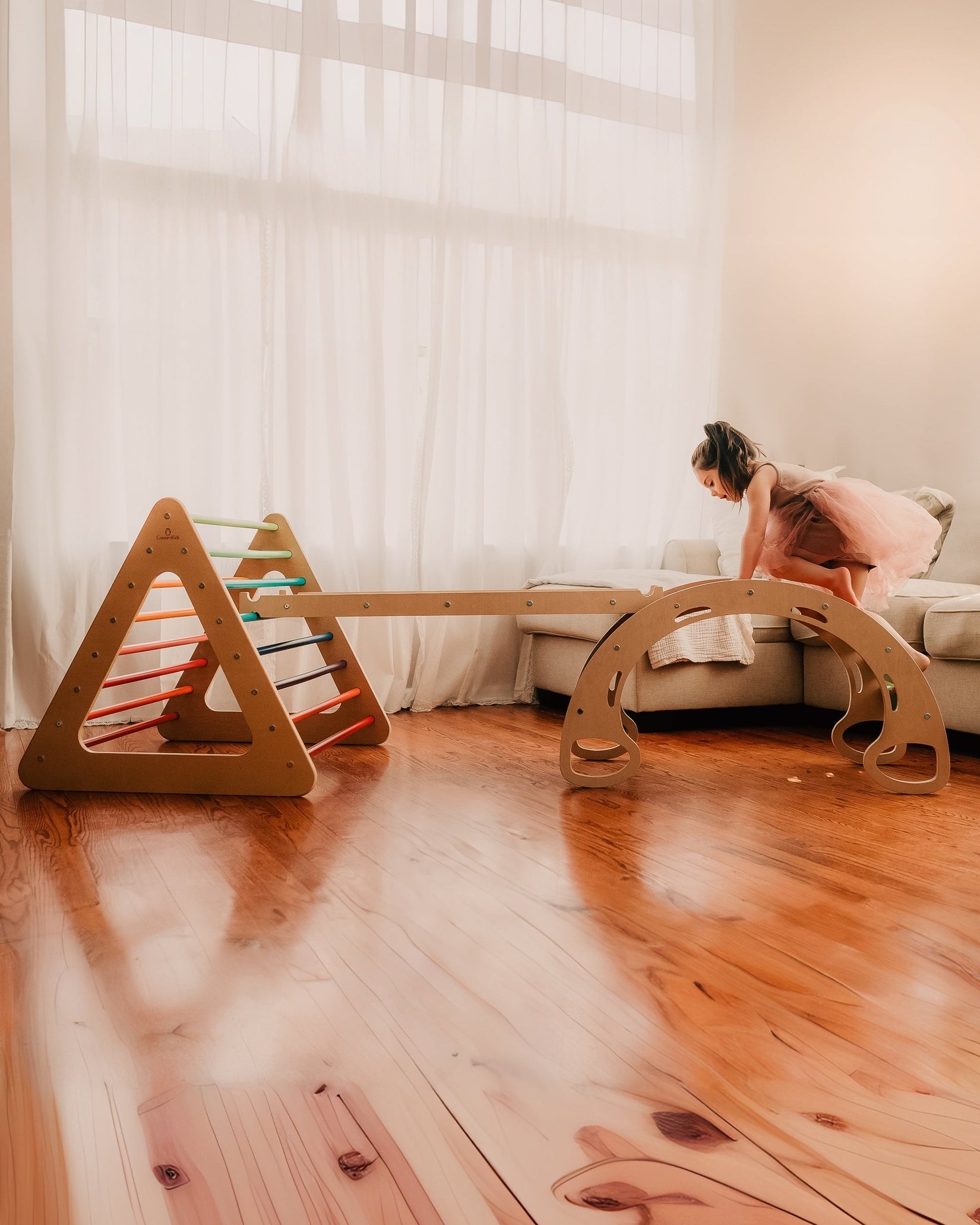The Pamir Climbing Playset provides a timeless indoor activity that inspires children to explore while developing gross motor skills, strength, and confidence through engaging play. Elegantly designed for longevity, this set includes a jumbo rocker, climbing triangle, and reversible ramp—each representing a key step in your child’s growth. Suitable for climbers of all ages, every handcrafted component is made from FSC/PEFC-certified sustainable wood and coated with water-based lacquer and paint. Its sleek, minimalist style encourages imaginative play, making it a refined addition to any play space.