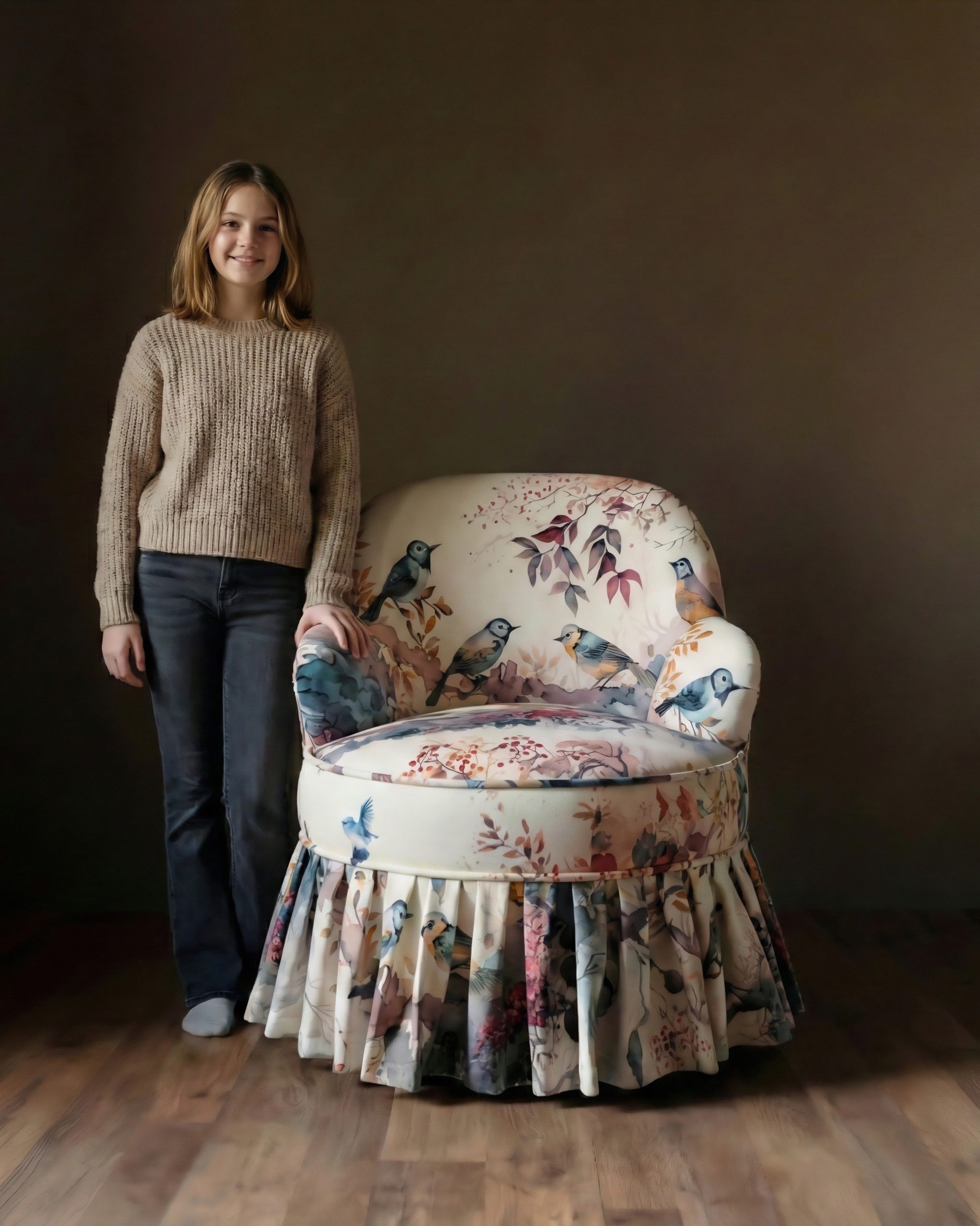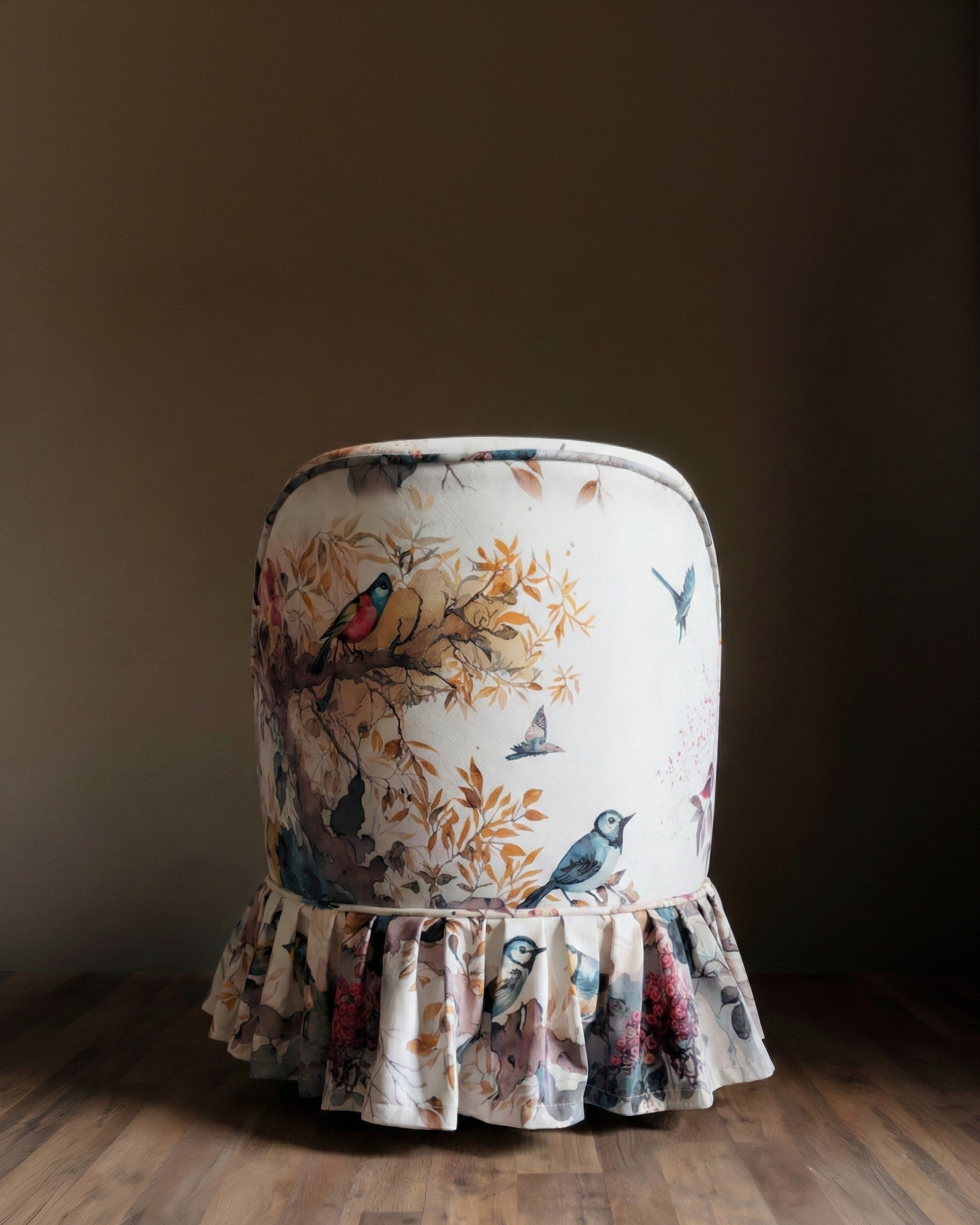 Introducing the Byrd Ruffle Velvet Chair, a truly enchanting piece that brings whimsical elegance and luxurious comfort to any room. Adorned with a delightful bird and botanical print, the Byrd sofa features plush velvet upholstery that is soft to the touch, ensuring a cozy & inviting experience. The vibrant pattern, showcasing a charming array of birds nestled amongst lush foliage and blossoms, creates a captivating focal point that will spark joy and conversation. A unique ruffled skirt adds a playful yet sophisticated detail, making the Florence sofa a perfect accent for a cozy reading nook, a sunlit conservatory, or a creatively styled living room.