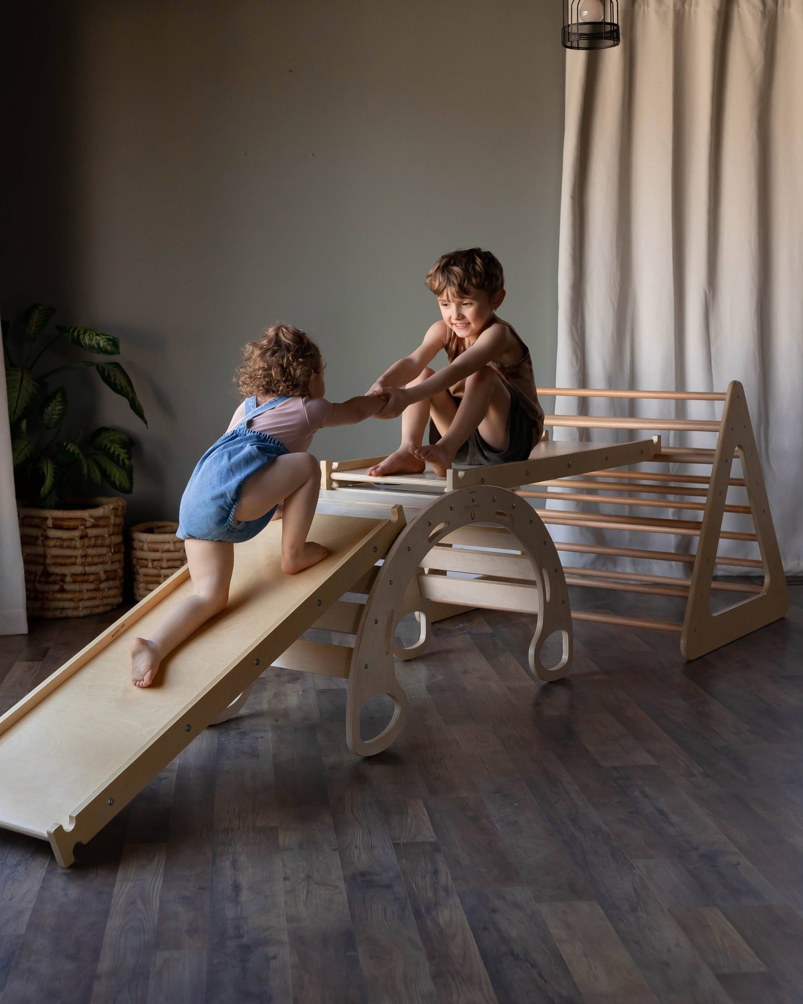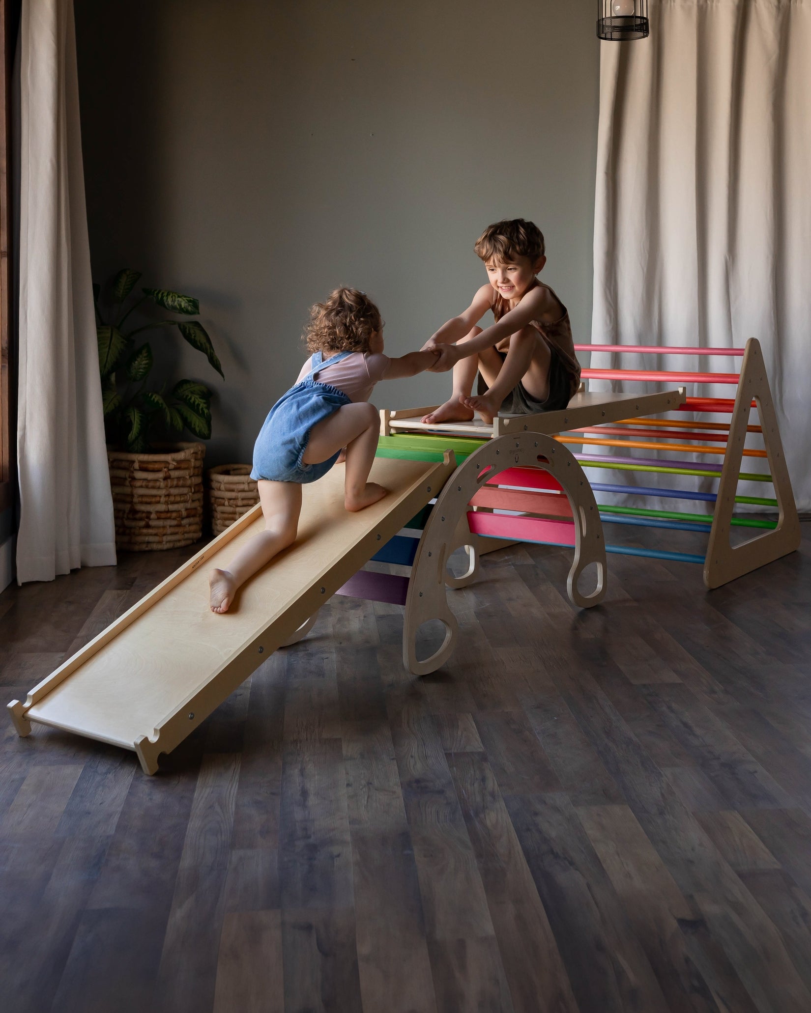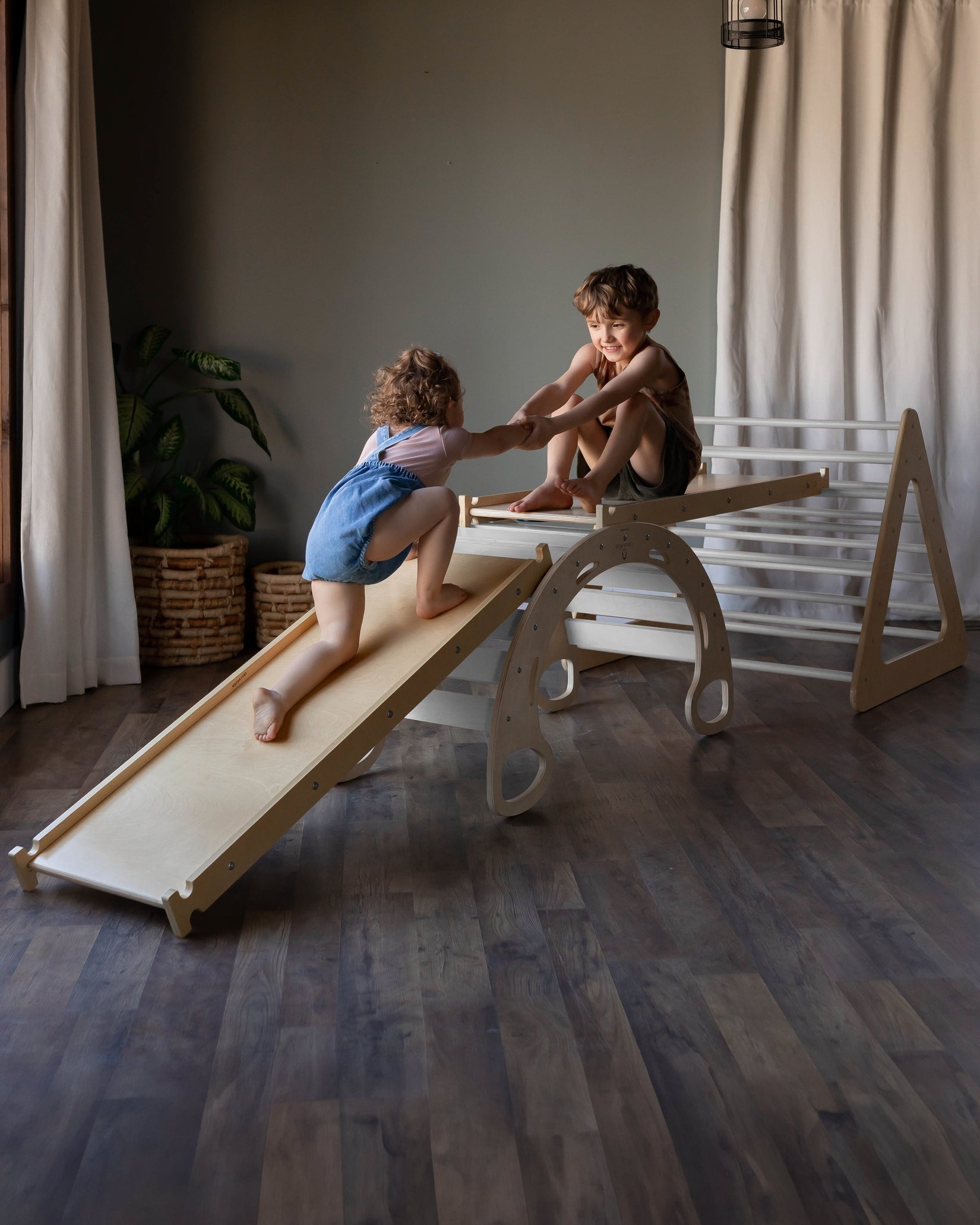 The Blue Ridge Waldorf Playset invites children to explore and develop gross motor skills, strength, and confidence through hands-on climbing experiences. Designed for children aged six months and older, it supports early milestones such as pulling up and grasping rungs, progressing to full climbs as strength and assurance build. With the addition of a blanket, this versatile playset transforms into a cozy tent or reading nook, offering a serene space for quiet moments and imaginative play.