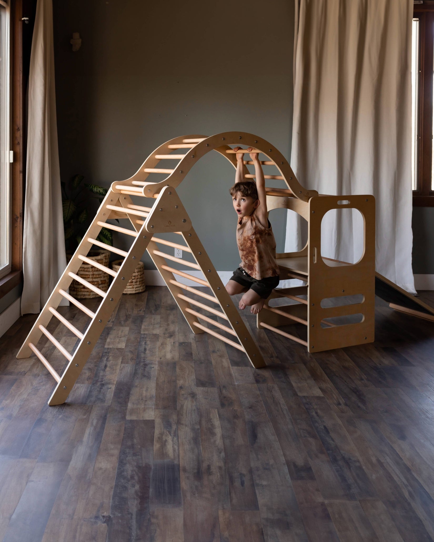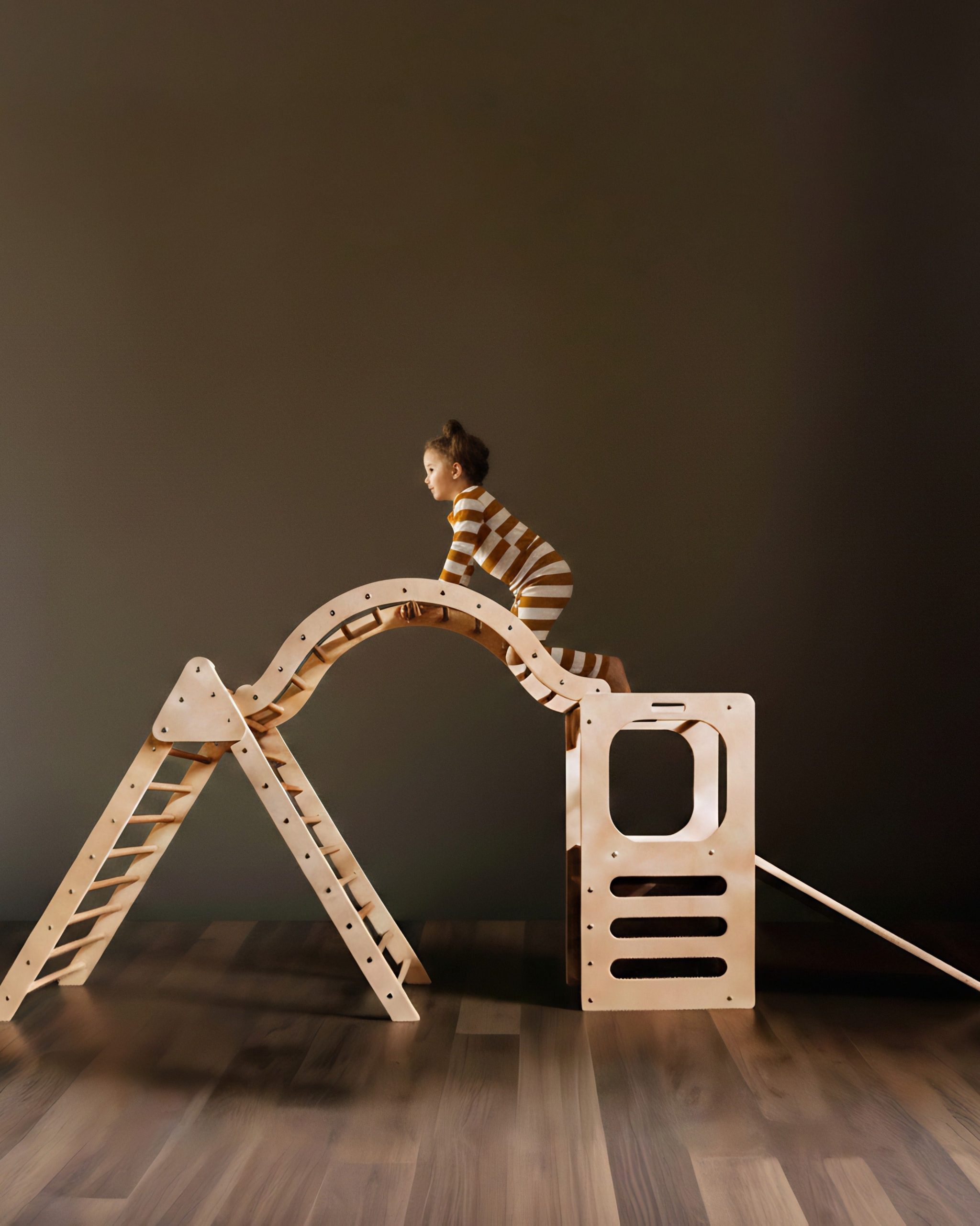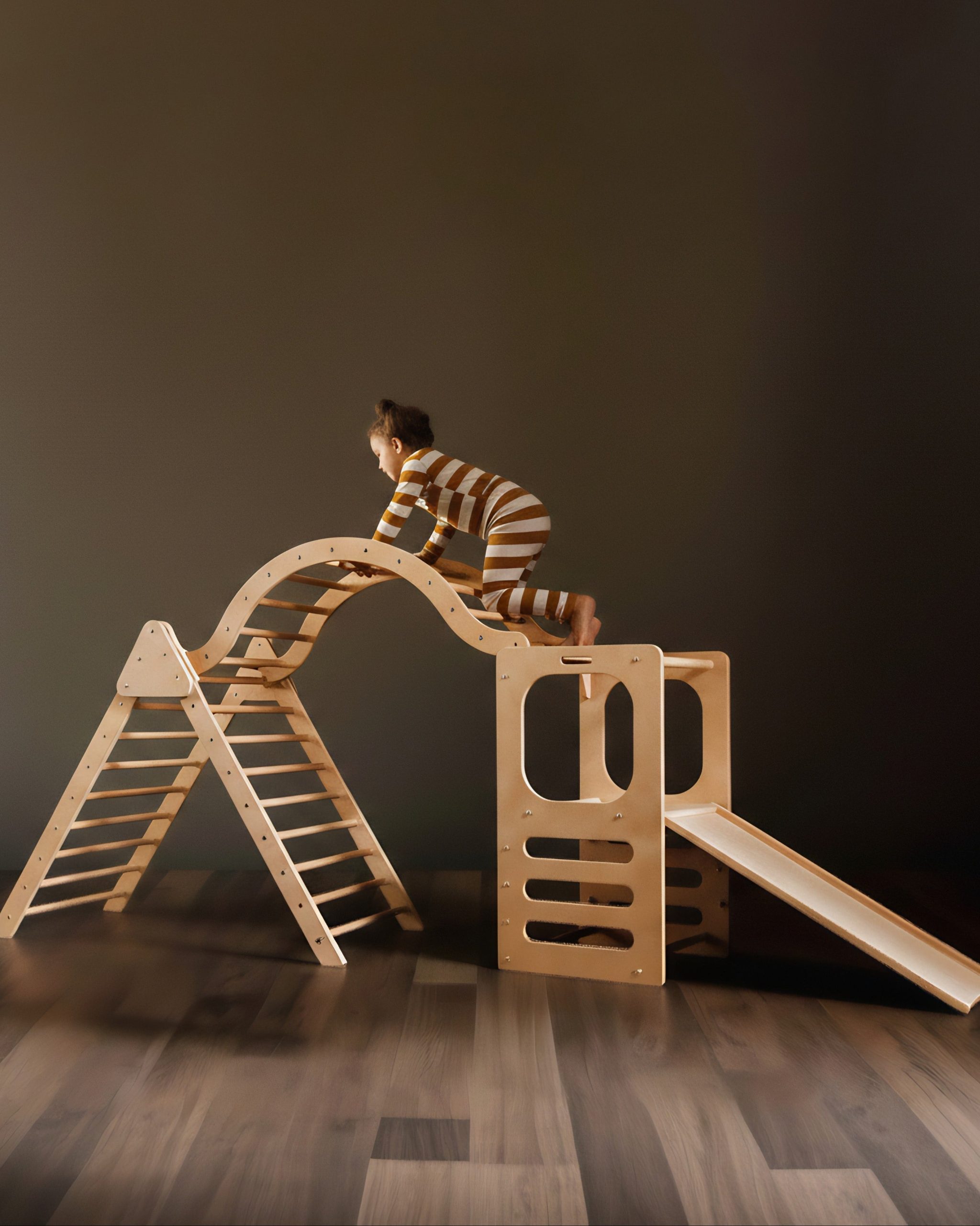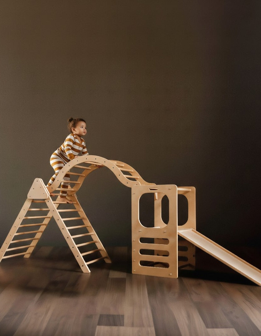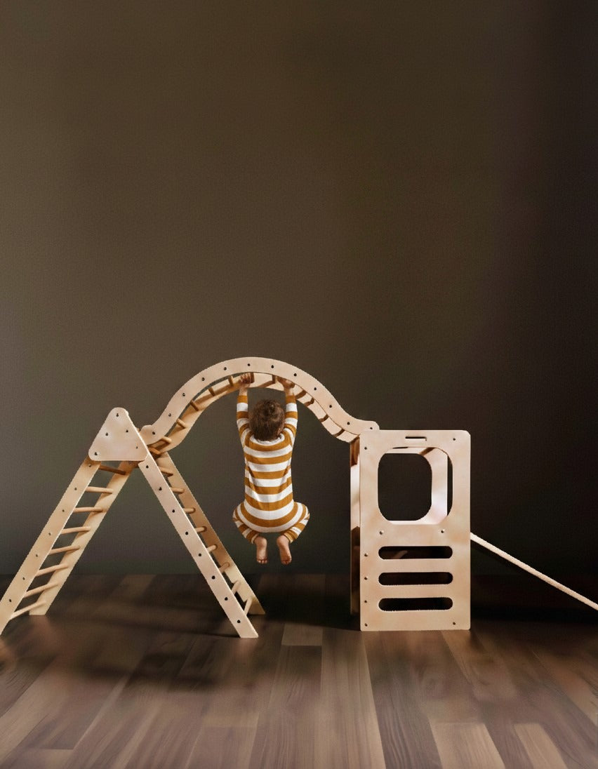 Enhance your child’s development and enjoyment with the elegant Broad Peak Waldorf playset. This thoughtfully designed set sparks creativity and supports active play, featuring a Waldorf Play Tower with slide and chalkboard alongside a jumbo foldable climbing triangle and an arch. Built to last, it offers safe opportunities to climb, slide, and balance within the comfort of your home. Connect the arch to form an exciting bridge or use the pieces separately for varied play experiences. At day’s end, gather around the play tower to share a refreshing smoothie, blending fun and family moments seamlessly.