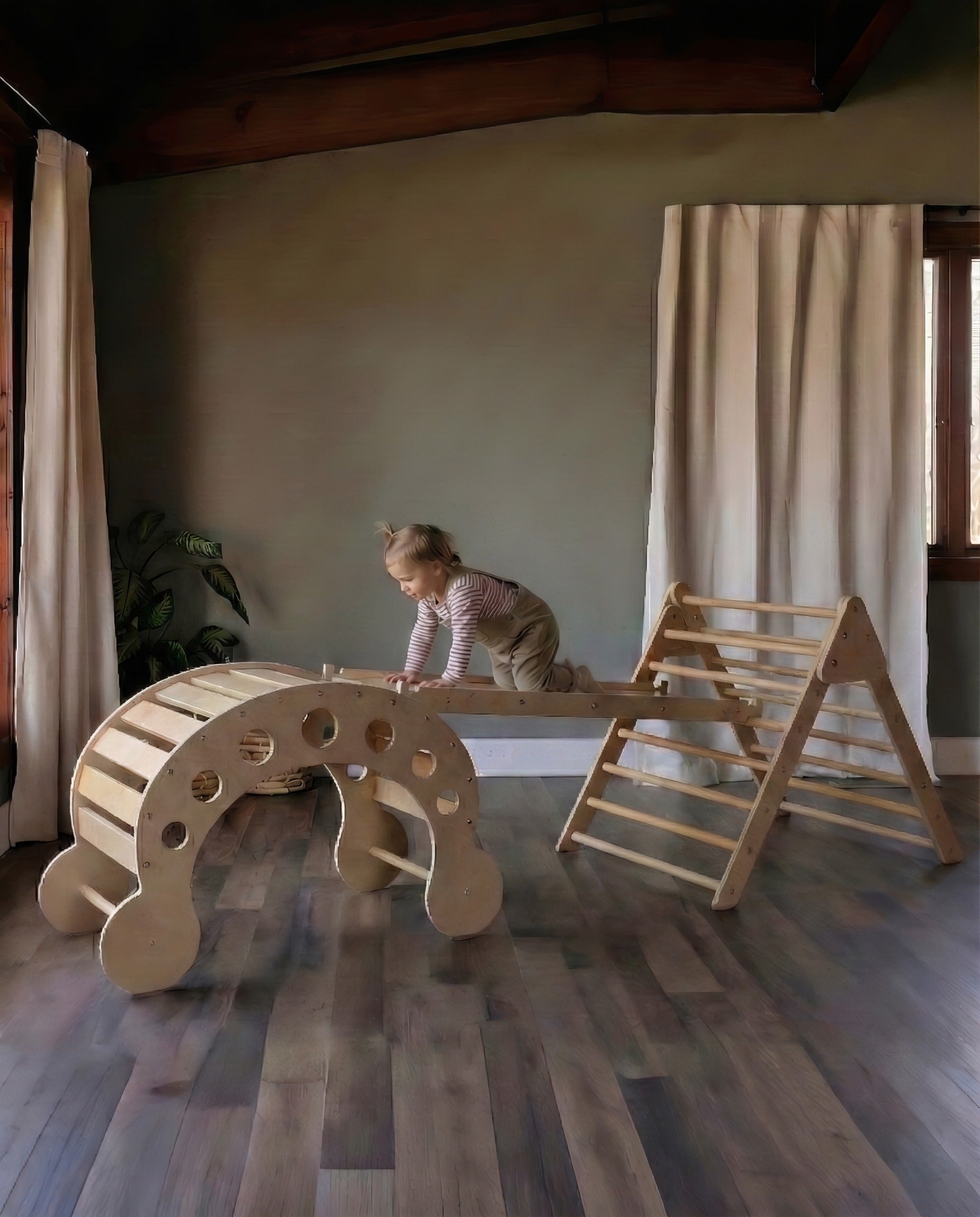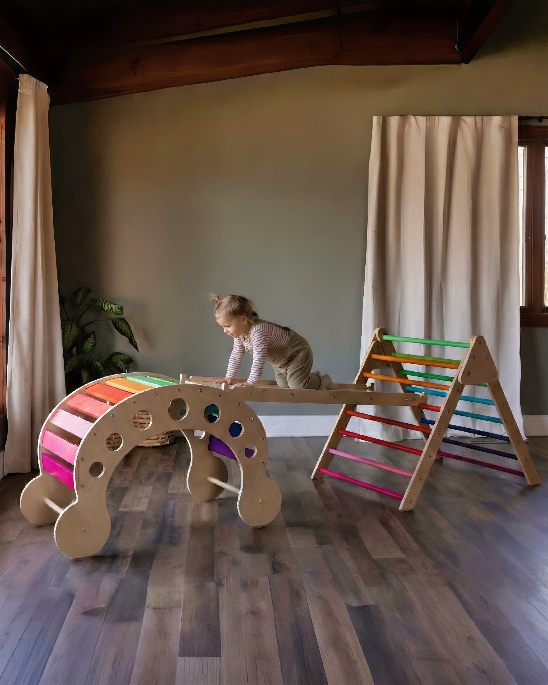 The Cassarokids Extra Large Waldorf Climbing Playset brings together three versatile wooden components—a generous foldable climbing triangle, oversized Waldorf rocker, and expansive reversible climbing ramp—designed to cultivate active, creative exploration. Each piece functions as a standalone play structure or seamlessly integrates with the others, allowing children to architect intricate configurations that evolve with their imagination and developmental needs.