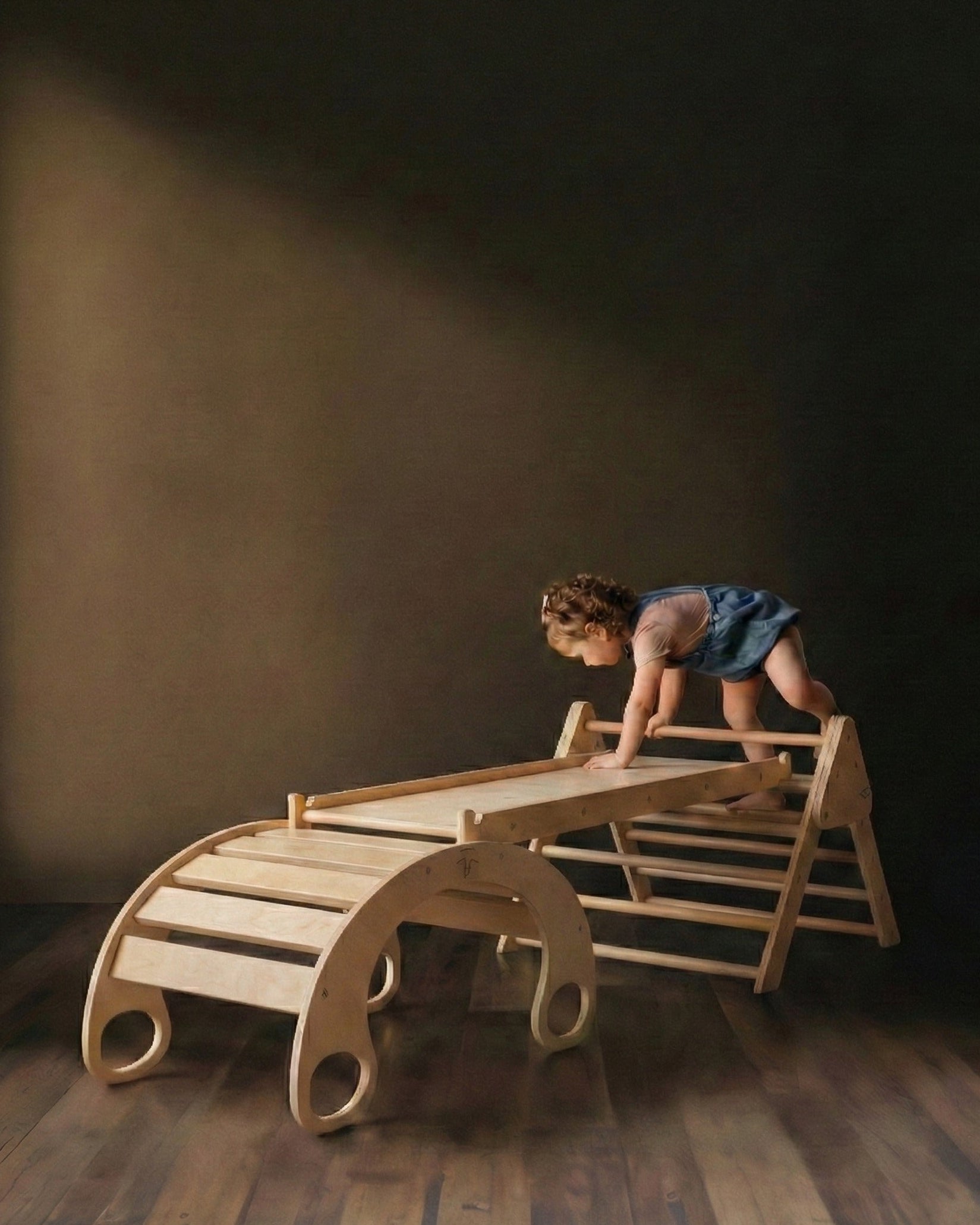 Create limitless indoor adventures with the small Waldorf Playset, a thoughtfully designed three-piece ensemble. This set features a compact foldable climbing triangle, a small Waldorf rocker, and a versatile reversible rock climbing ramp—ideal for active toddlers and preschoolers. While your little ones climb, hang, jump, rock, and slide safely within their playroom, you can savor a peaceful morning coffee, perhaps even a second. The playset encourages imaginative exploration, allowing children to assemble towers and bridges or embark on journeys to triangle-shaped islands. Inspire boundless creativity and extended playtime with this elegant indoor solution.
