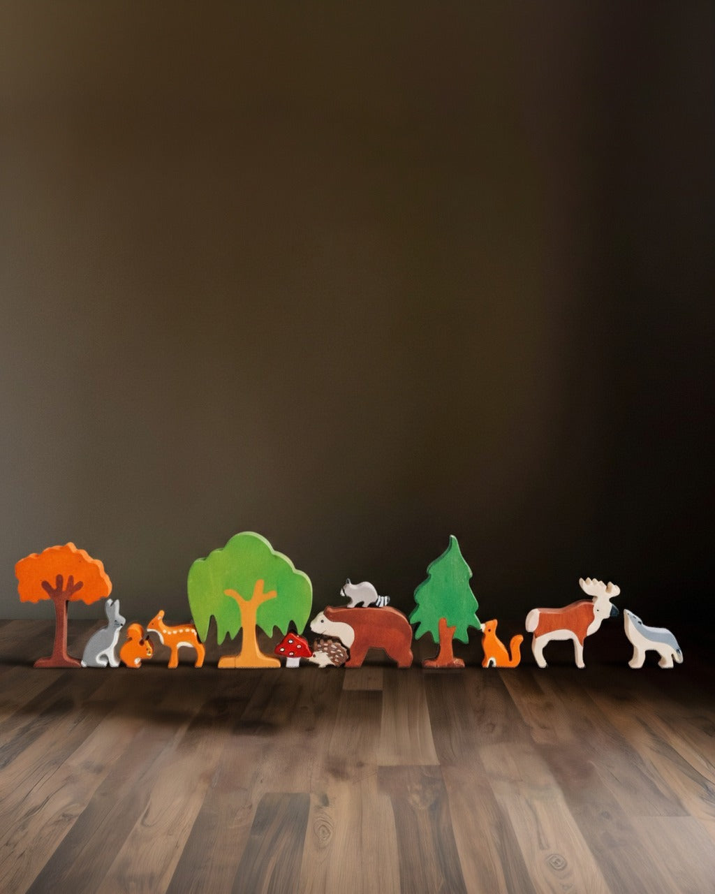 This 15-piece Waldorf collection features beloved woodland animals such as a fox, wolf, squirrel, badger, hedgehog, brown bear, moose, rabbit, raccoon, and deer, accompanied by a maple tree, conifer tree, oak tree, hickory tree, and a mushroom.
