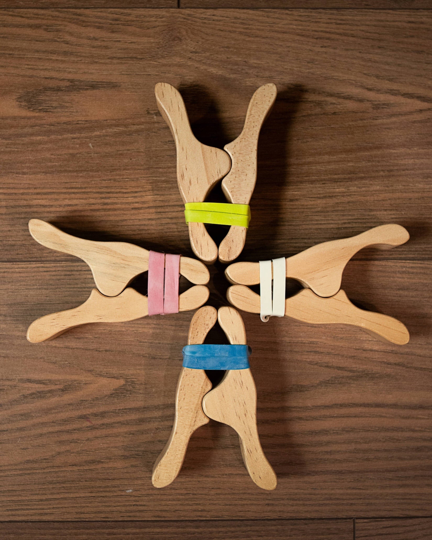 Crafted from natural oak wood, these clips offer a lightweight and smooth feel while maintaining robust durability for energetic play. Ideal for constructing blanket forts, securing fabrics on play stands, or imaginative activities such as dinosaur and robot hands, each set contains four clips with multicolored rubber bands plus eight extra bands for extended creativity.
