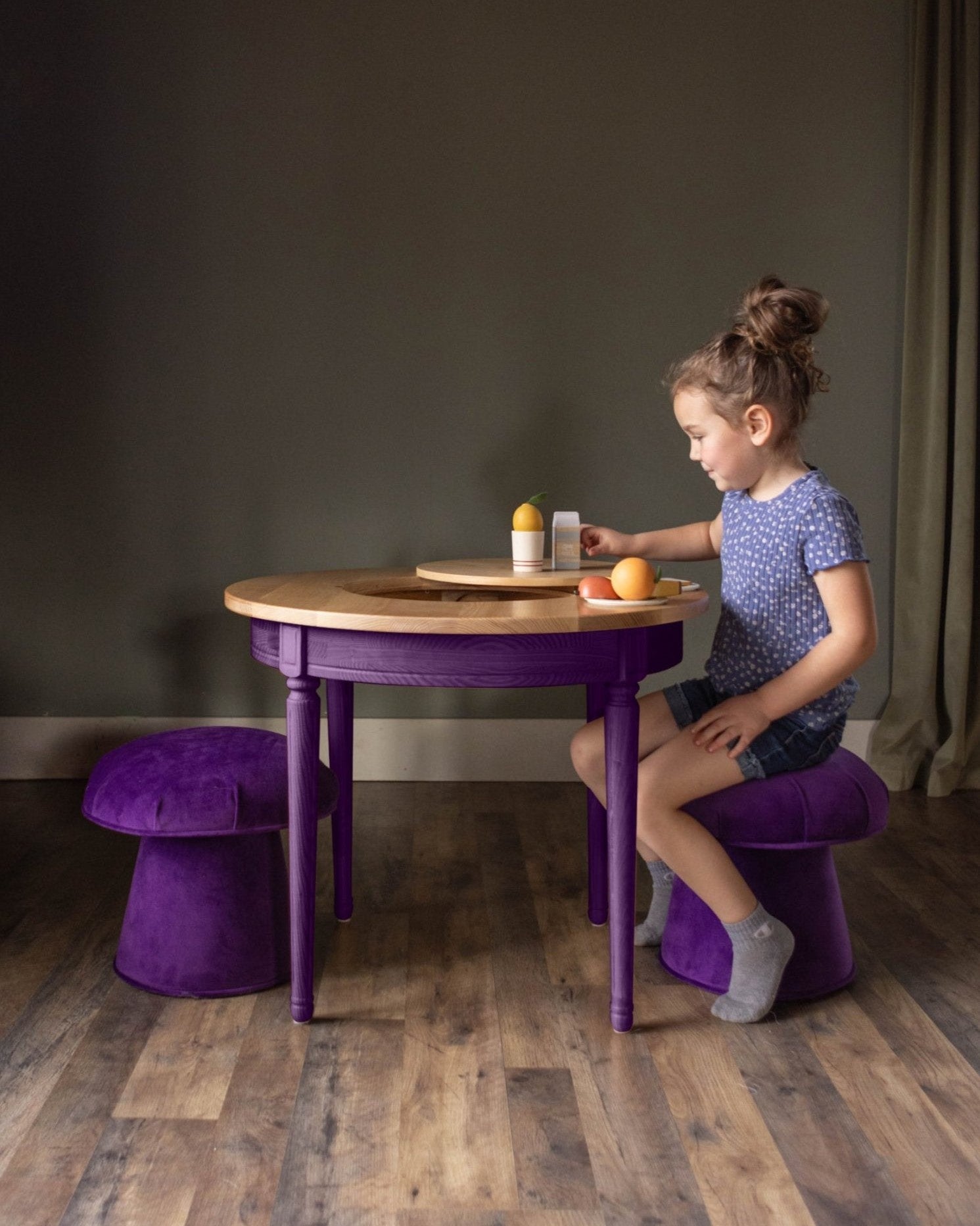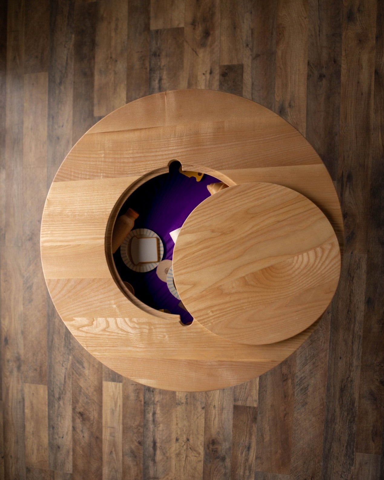 The Genevieve play table with storage is a versatile & functional addition to any playtime setup, providing both entertainment and organization. Crafted from durable solid oak, this charming table offers a safe and sturdy option for play. Choose from a range of elegant colors such as marigold, forest green, purple, black, and natural tones, to create a serene and personalized space for your child to relax and play in.
