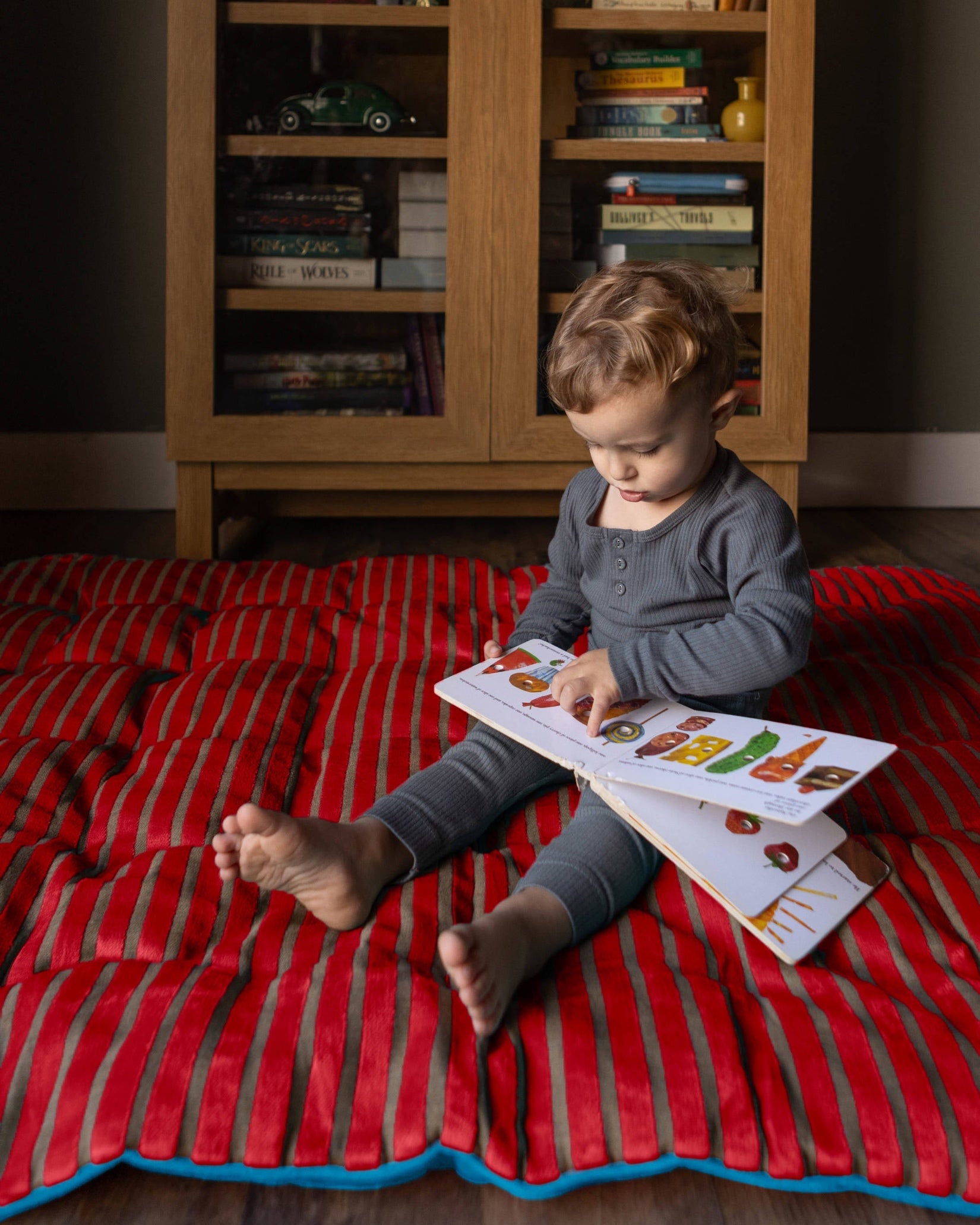 This pillow is massive, durable, and incredibly soft. The tufted construction keeps the stuffing neatly in place, even during pillow forts or storytime marathons. We love the reversible design—featuring a bright pop of color on one side and a calmer tone on the other—letting you match the energy of the room in seconds. It’s the perfect spot for kids to play and adults to relax.