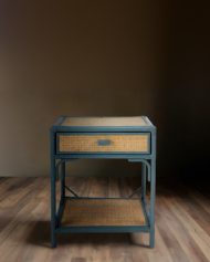 Bring a breath of fresh air to your bedside with this beautifully handcrafted nightstand. Perfectly balancing organic texture with modern color, this piece features a sturdy bamboo frame finished in a serene dusty blue, framing the warmth of natural woven rattan panels.