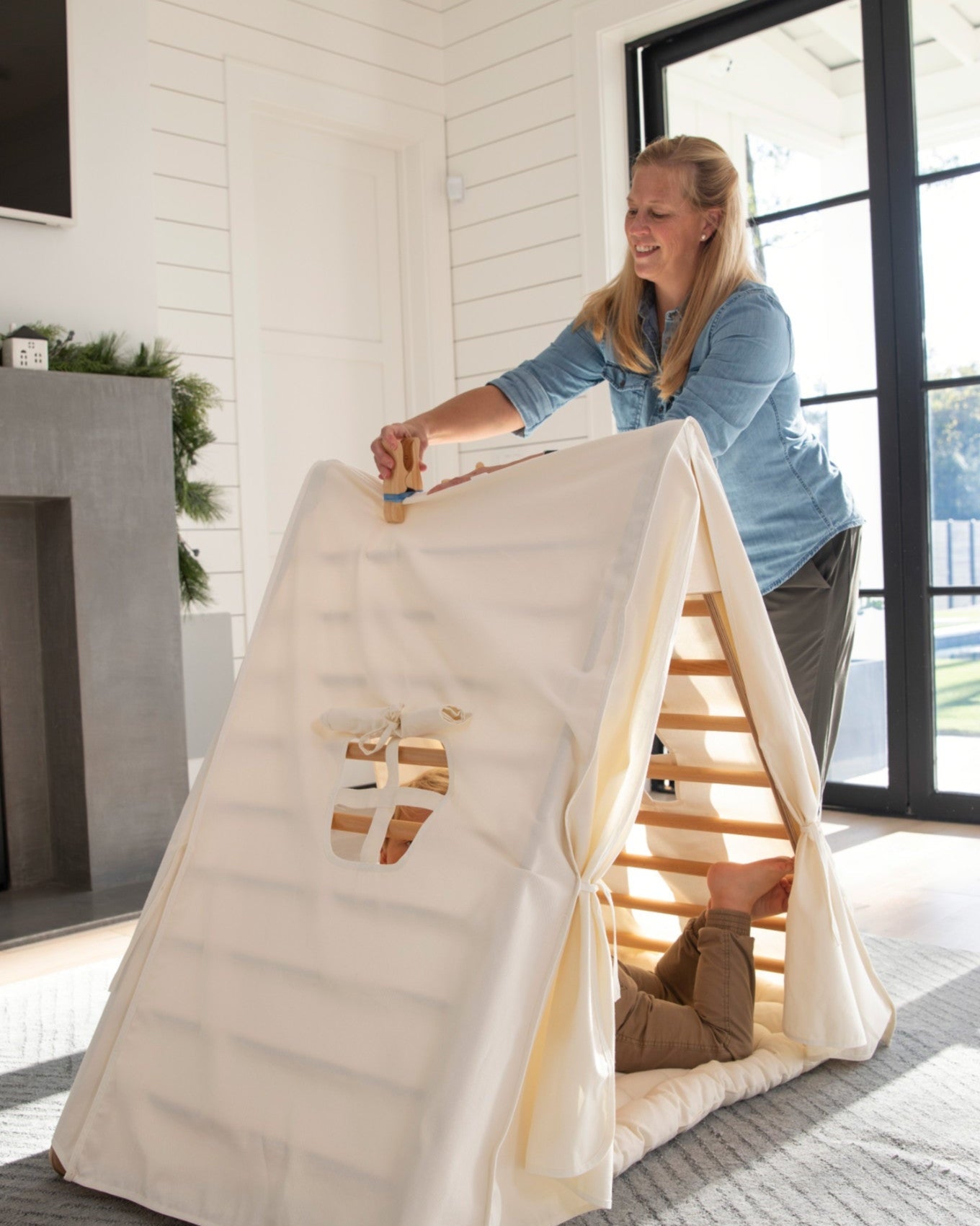 Place children in a world of imagination with this play tent! Perfect for a playroom or living room, it covers your existing Pikler Triangle and provides a space for kids to enjoy their favorite toys and stuffed animals or create their own cozy haven of blankets and pillows. Inspire little dreamers to use their imaginations and visit far-off lands, all from the comfort of home!