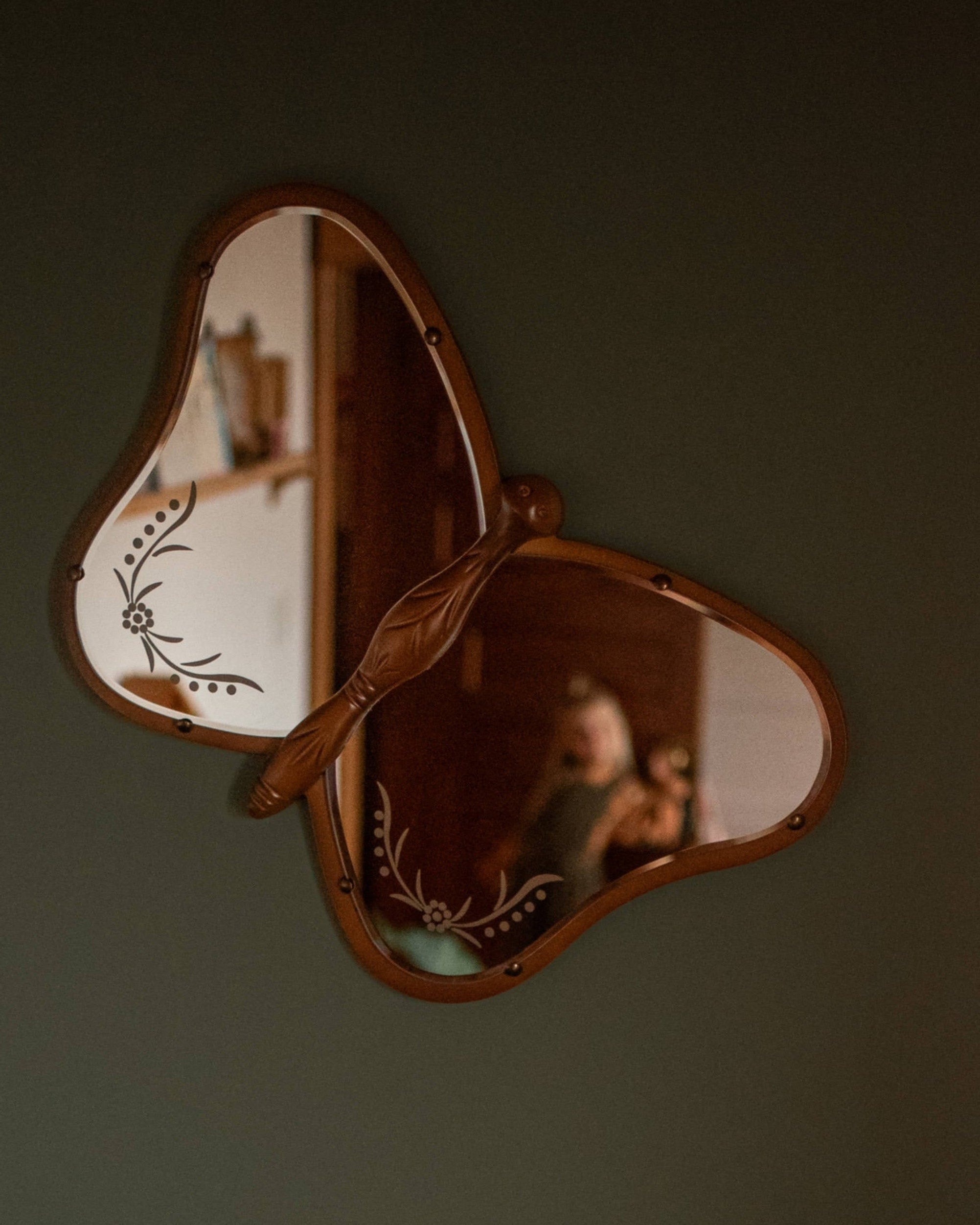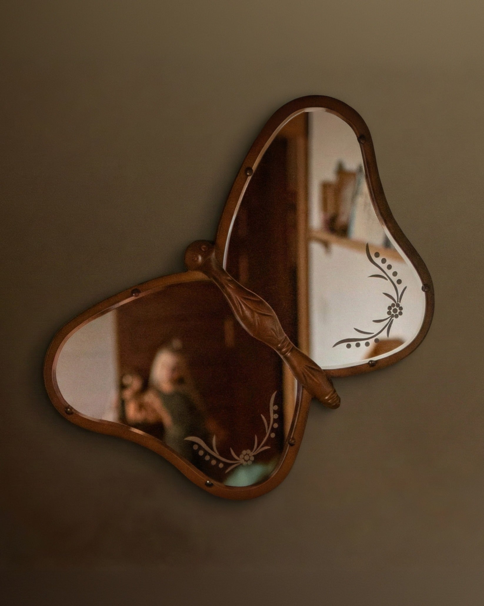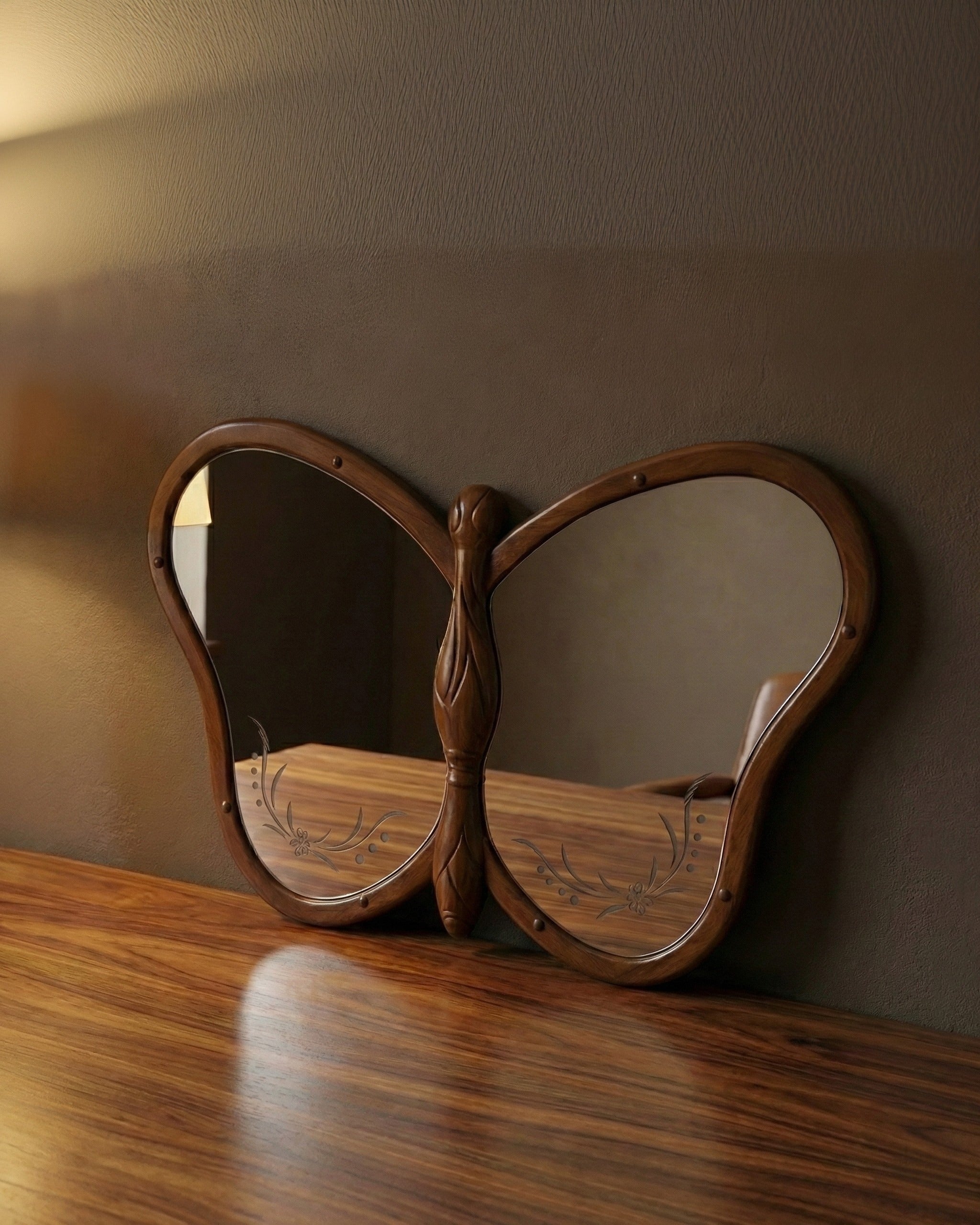 Hewn from solid, select walnut, the frame boasts a deep, lustrous grain that warms any interior. The central body is meticulously hand-carved, grounding the ethereal shape with tactile detail, while visible antiqued joinery adds an industrial-chic touch to the wing’s curves. The mirror itself is finished with delicate, heirloom-quality floral etchings that dance across the reflection. This is a statement piece designed to be cherished—a captivating focal point for the entryway, boudoir, or curated living space.