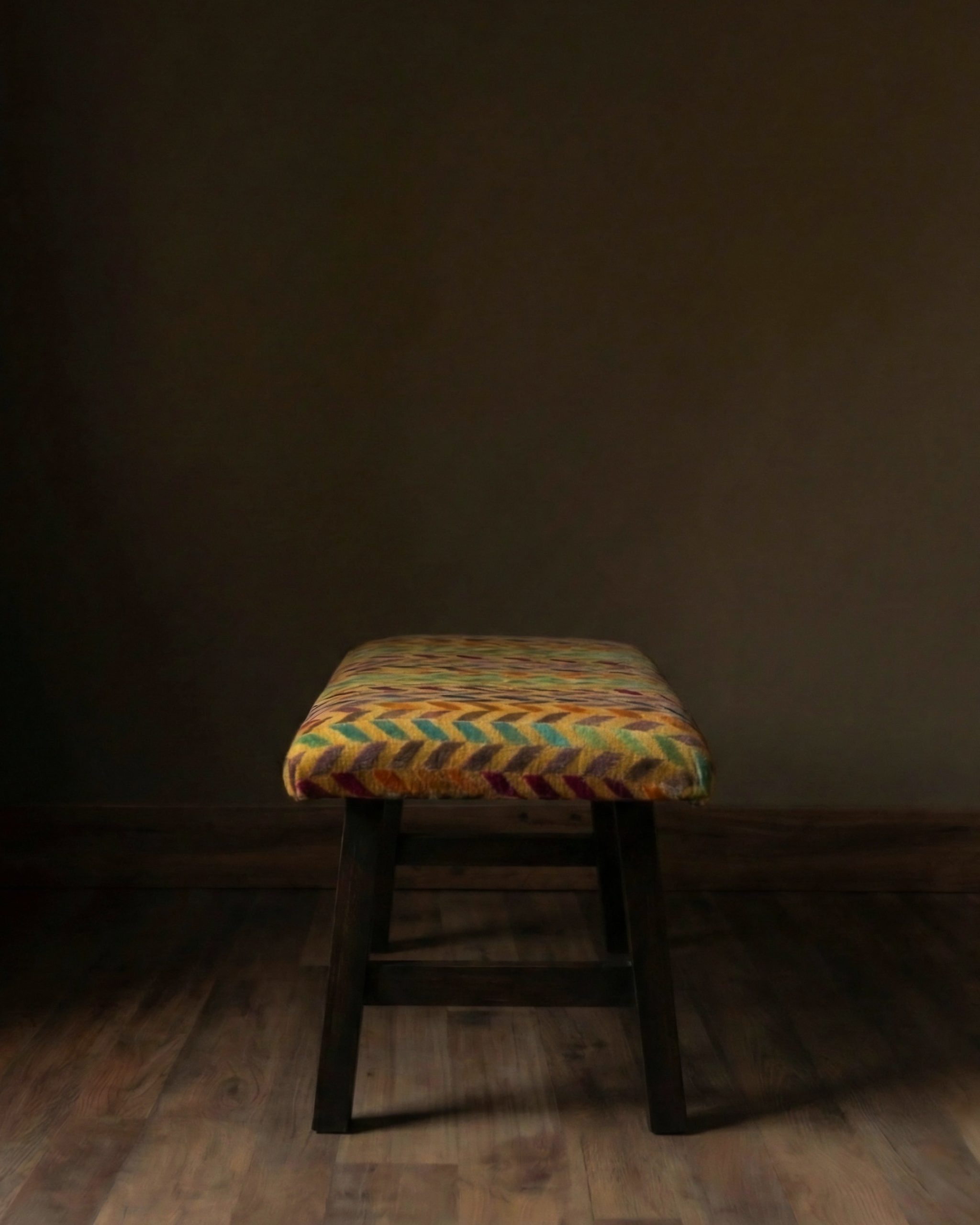 Add a touch of eclectic elegance to your home with this stunning solid wood bench. Crafted with a sturdy, dark-finished wooden frame and legs, this bench offers durable seating and timeless appeal. The rectangular seat is luxuriously upholstered in a rich velvet fabric, featuring a vibrant, multi-colored chevron pattern in shades of marigold, red, green, and purple. This eye-catching design makes it a perfect accent piece for an entryway, dining room, bedroom, or living area. Its comfortable padding & unique style blend comfort with artistic flair, making it a versatile and stylish addition to any decor.