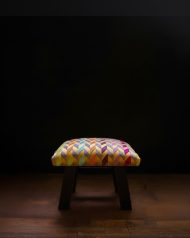 Elevate your living space with this exquisite handcrafted stool, a perfect blend of rustic durability and opulent textile design. The seat is upholstered in high-end French velvet, boasting a sumptuous pile that feels as luxurious as it looks. The vibrant, multicolored chevron pattern offers a tapestry of jewel tones designed to catch the eye. This plush top rests upon a robust, dark-finished wooden base, constructed with longevity in mind. It’s more than just a footstool; it’s a statement piece of functional art ready to add warmth and sophisticated bohemian charm to any corner of your home.