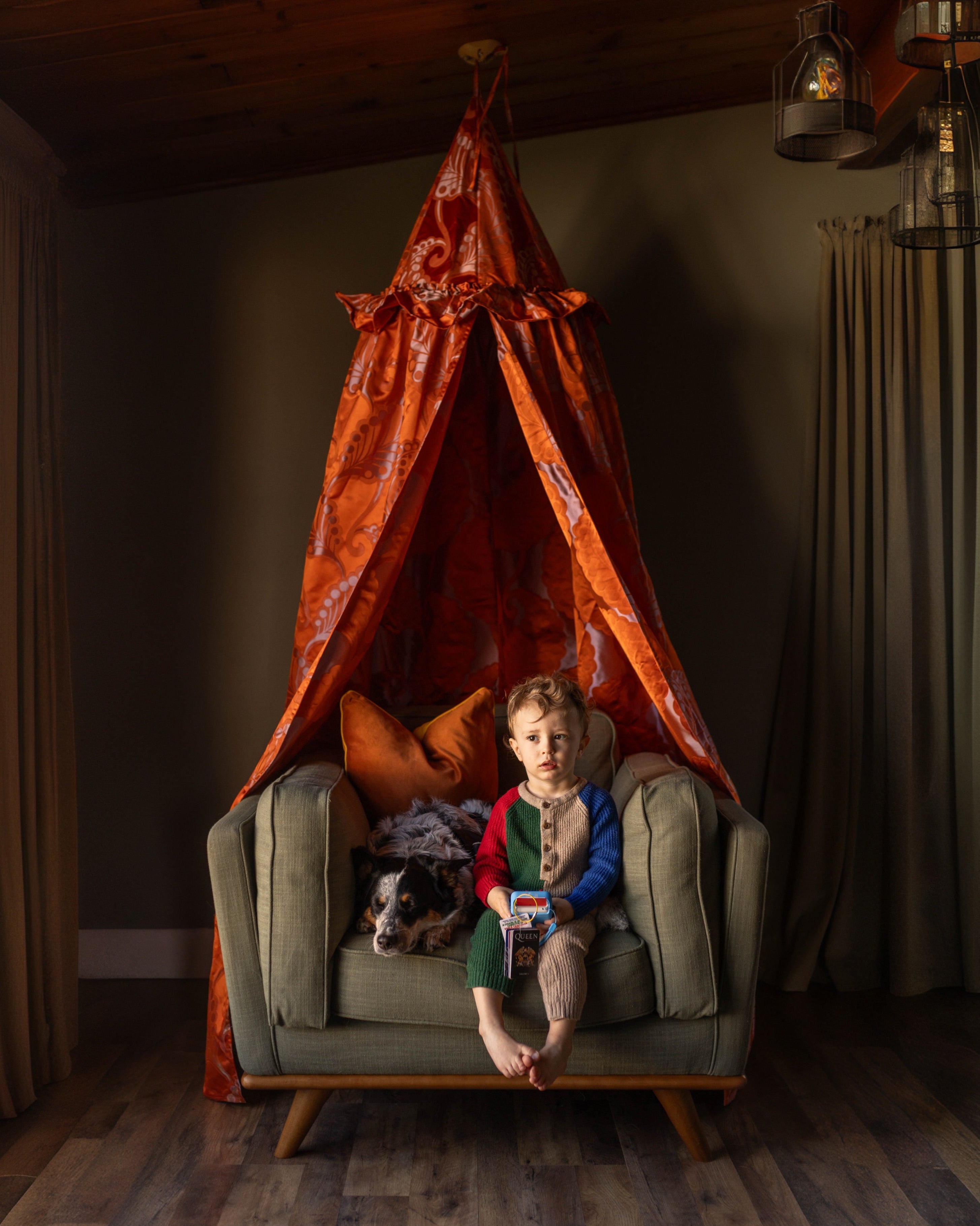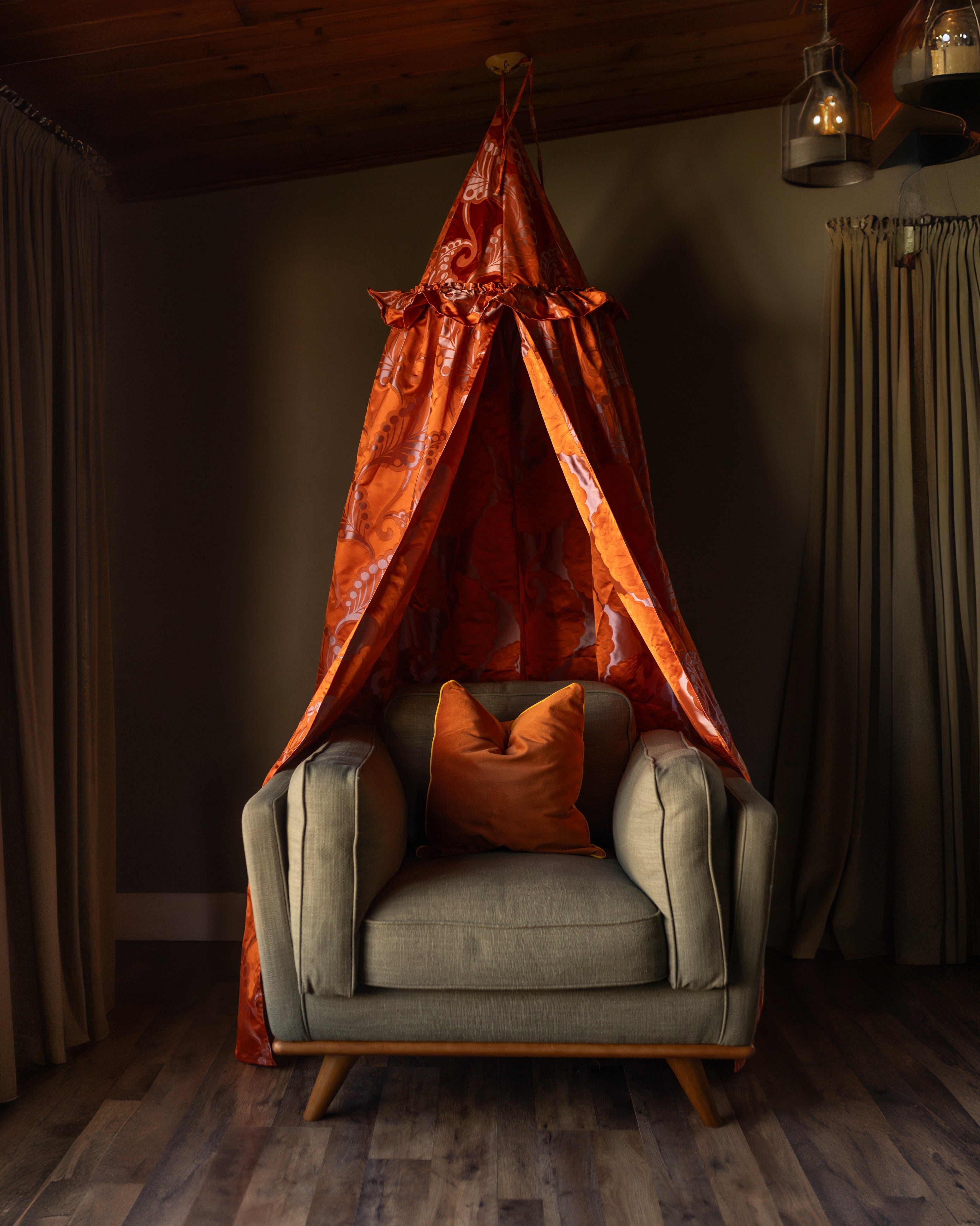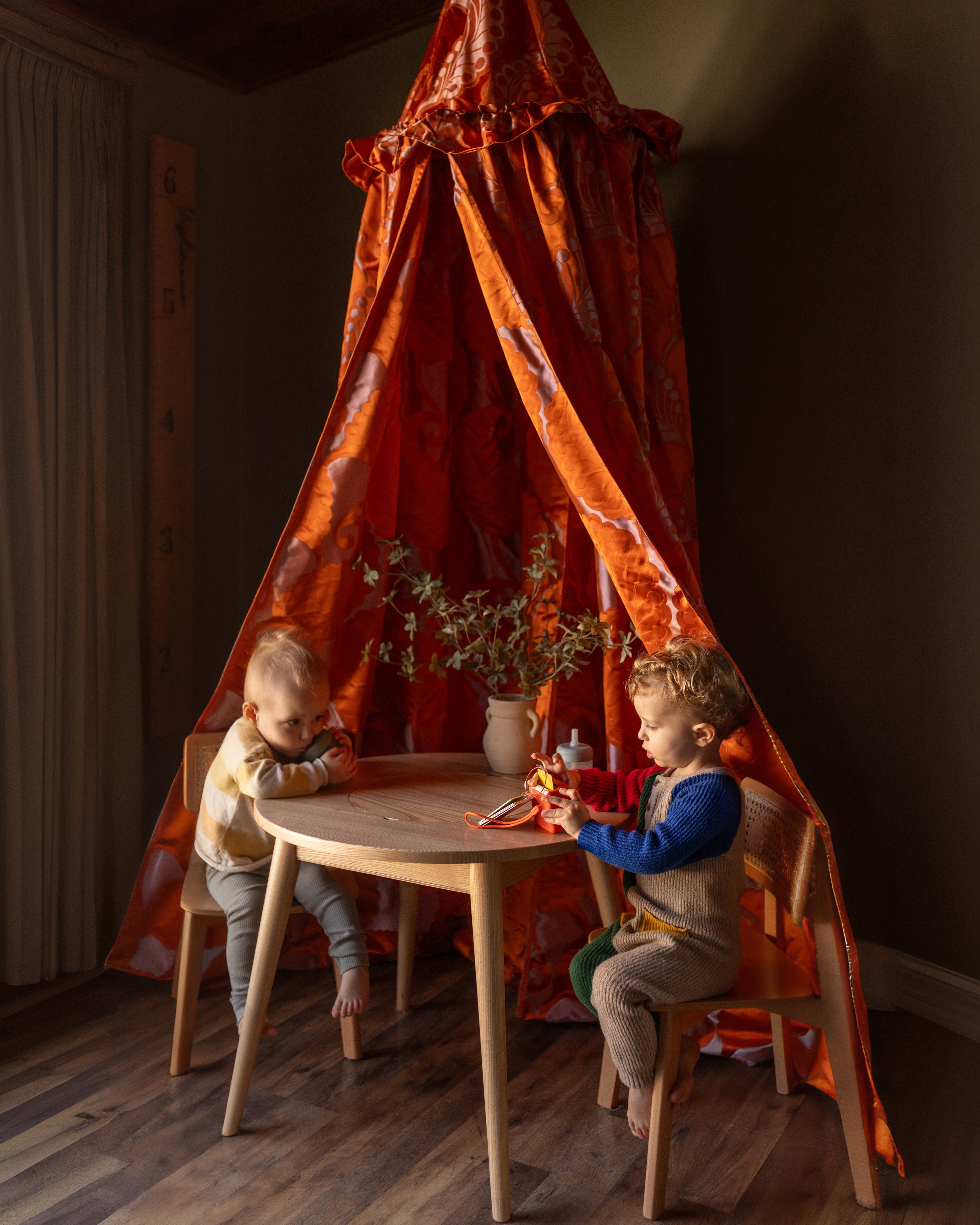 The Helene canopy features a vibrant orange hue, adorned with a delicate, intricate paisley pattern in a soft, contrasting shade. This timeless design brings a touch of sophisticated whimsy, perfectly complementing a high-end children's interior. Whether it's a quiet nook for reading and dreaming, a secret hideaway for imaginative play, or a stylish focal point in a curated playroom, the Helene canopy invites endless possibilities.