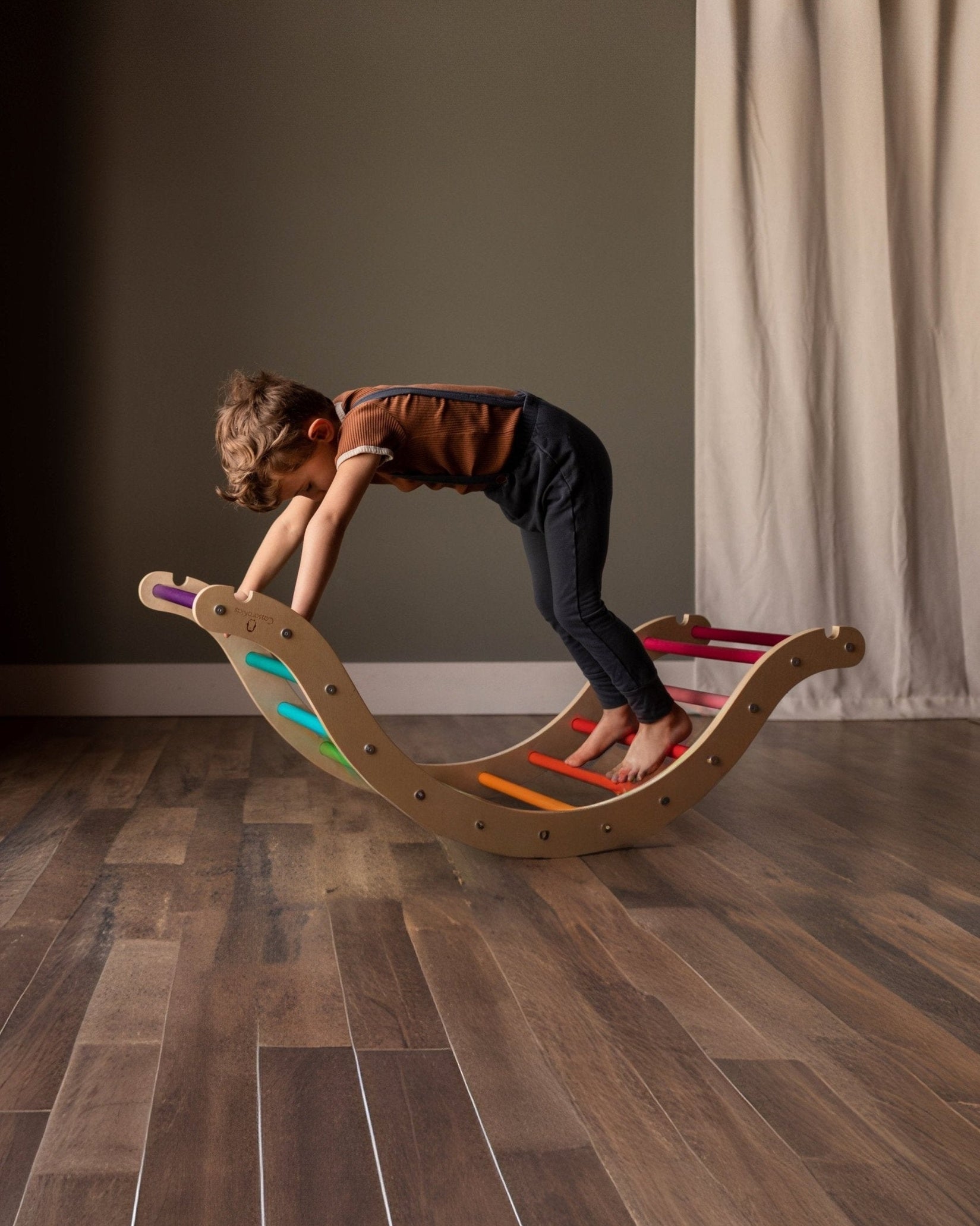 Experience the Jumbo Waldorf Arch, designed for both rocking and climbing fun. Use it solo for a gentle rocking motion, flip it to form a climbable arch, or connect it to our Cubes, Towers, or Climbing Triangles to enhance play possibilities. Adding a pillow creates a cozy spot for relaxing rocking. This adaptable piece invites endless imaginative play. Simply place it down and watch creativity unfold.