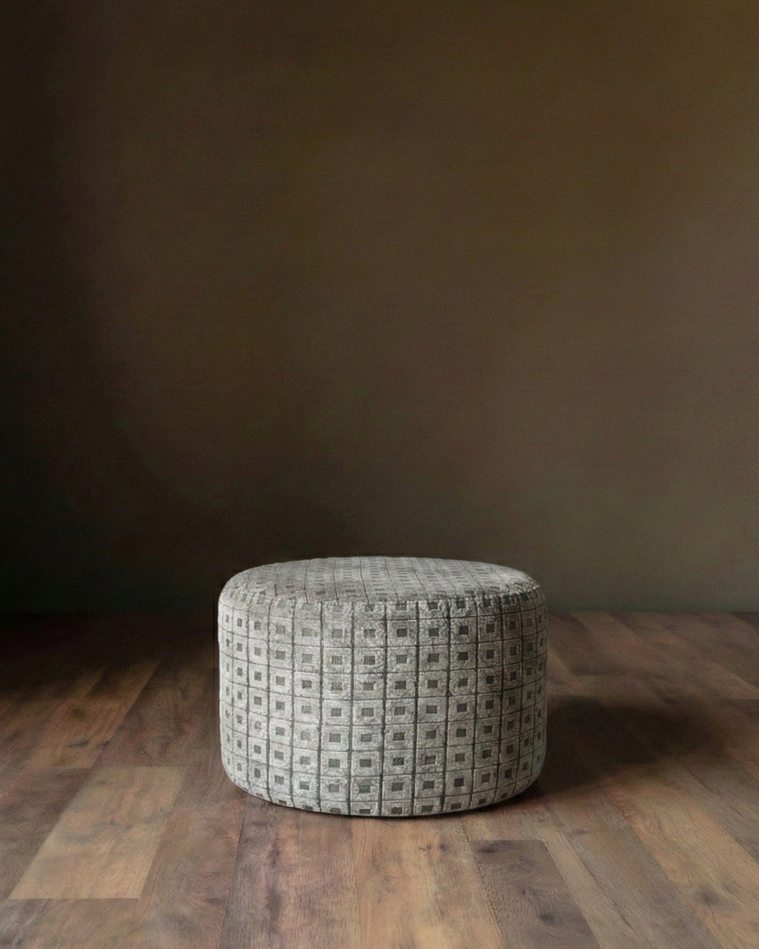Elevate your lounge area with structured softness. This cylindrical ottoman is upholstered in premium Belgian velvet, renowned for its superior sheen and durability. The textile features a striking geometric grid pattern that adds architectural dimension to the plush surface.