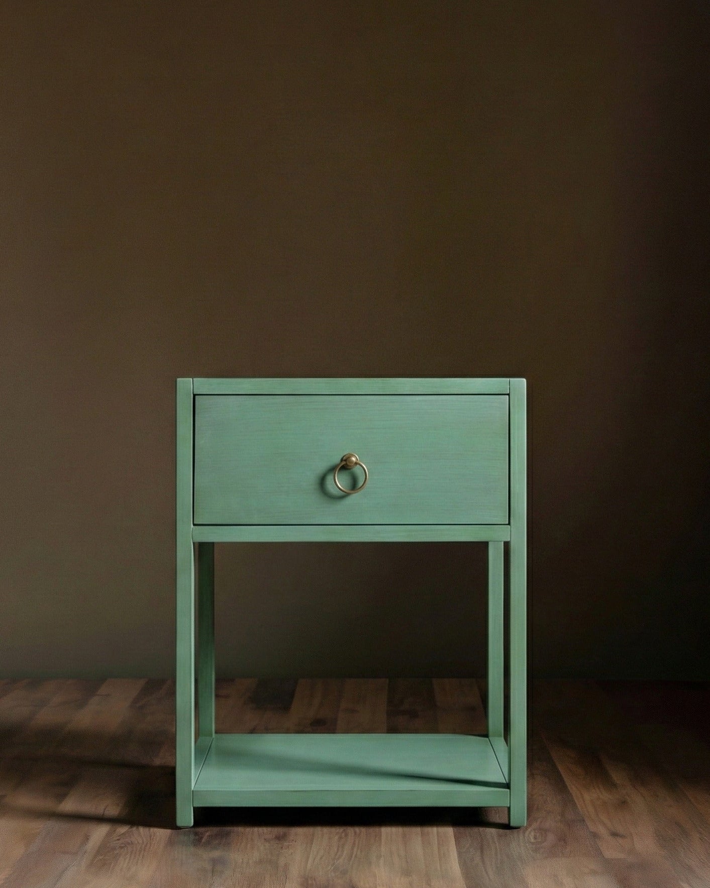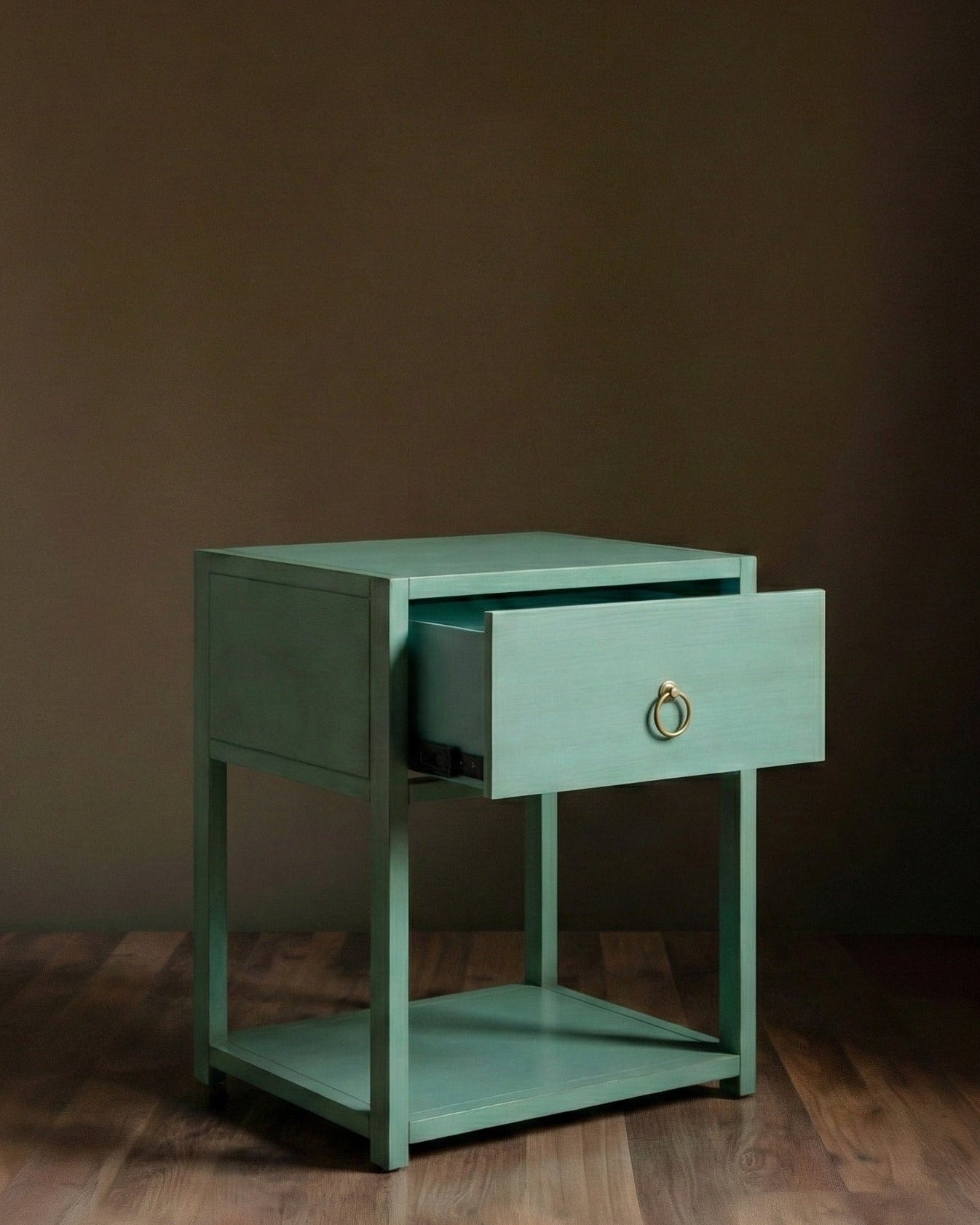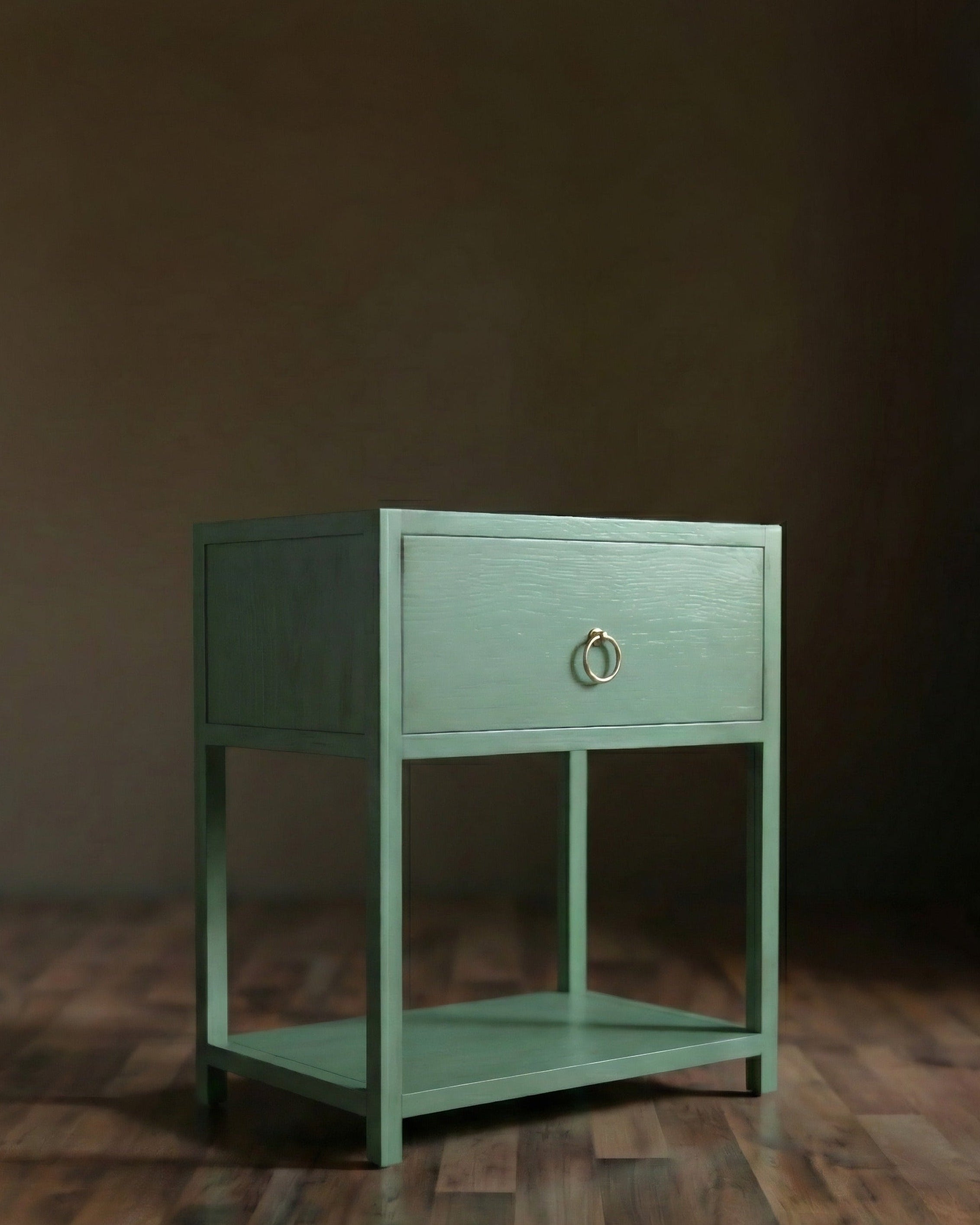 Elevate your organization with this stylish and sturdy solid wood nightstand. Defined by its beautiful aged turquoise & antique marigold with clean architectural lines, this piece offers essential storage without sacrificing style.