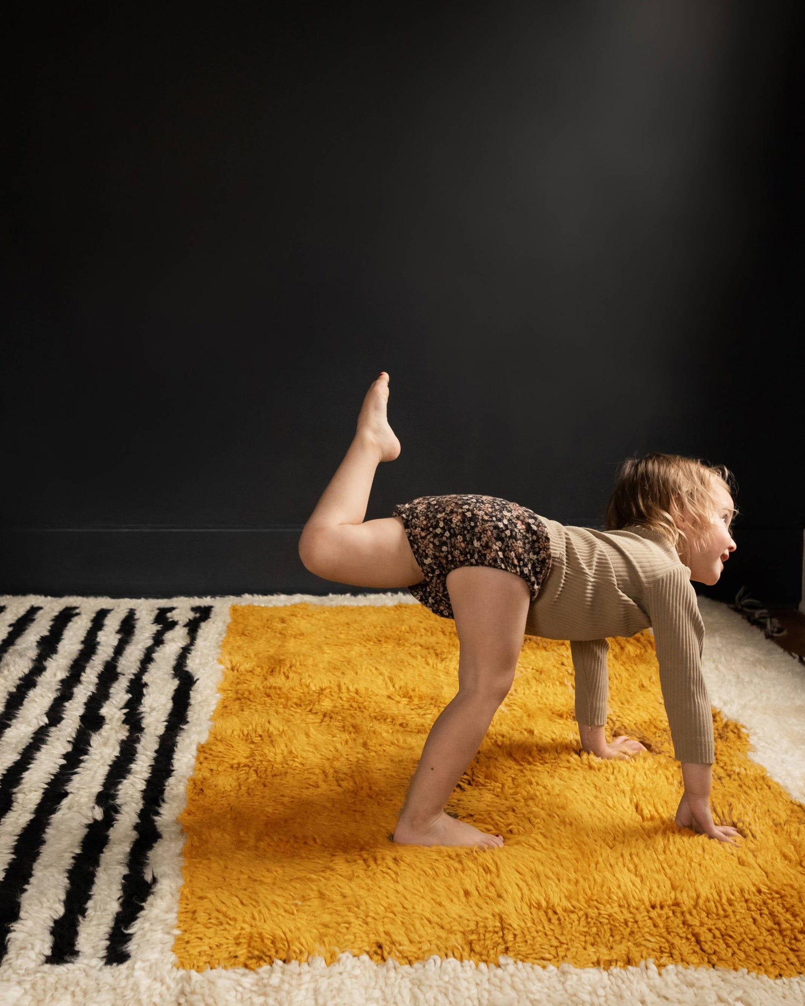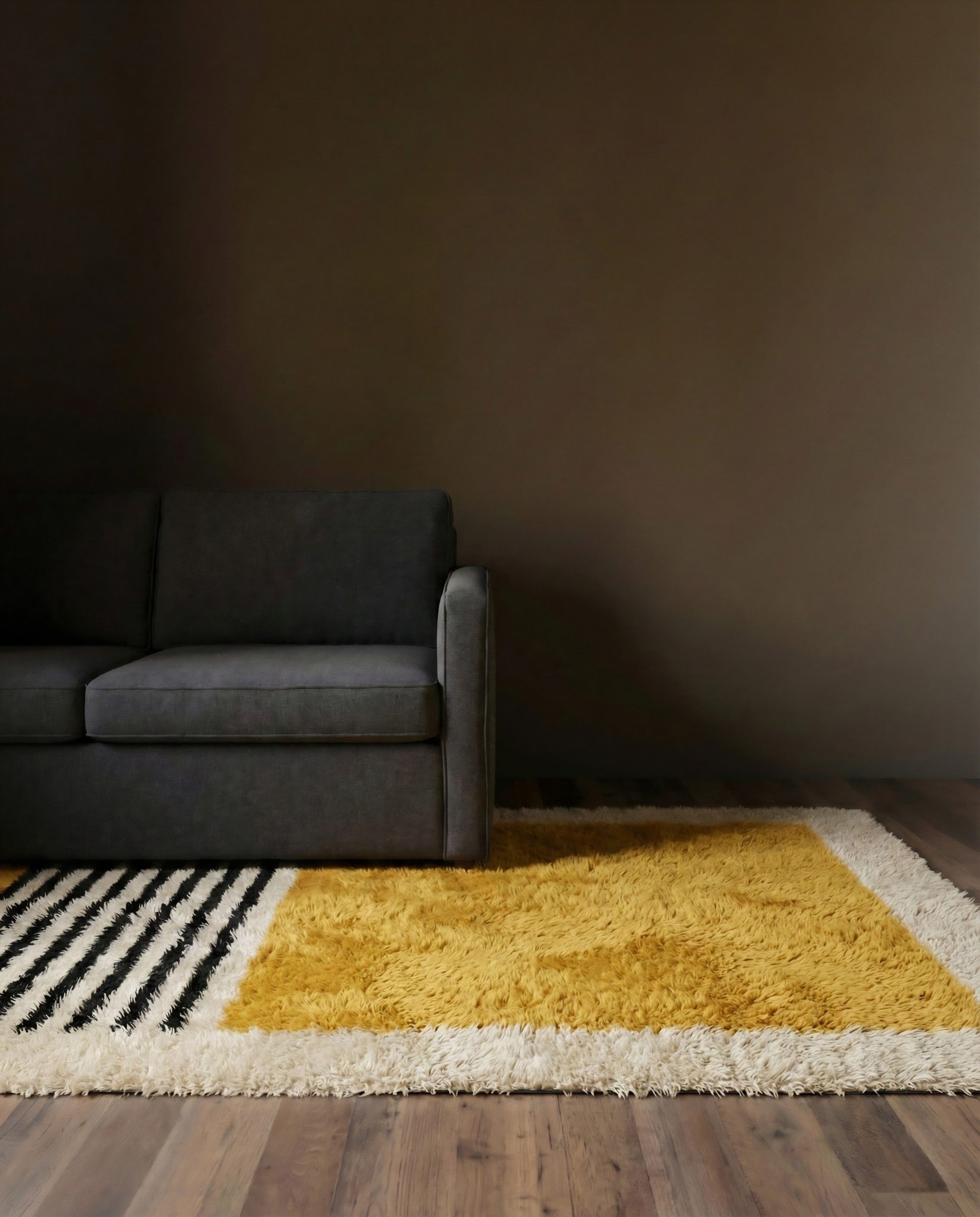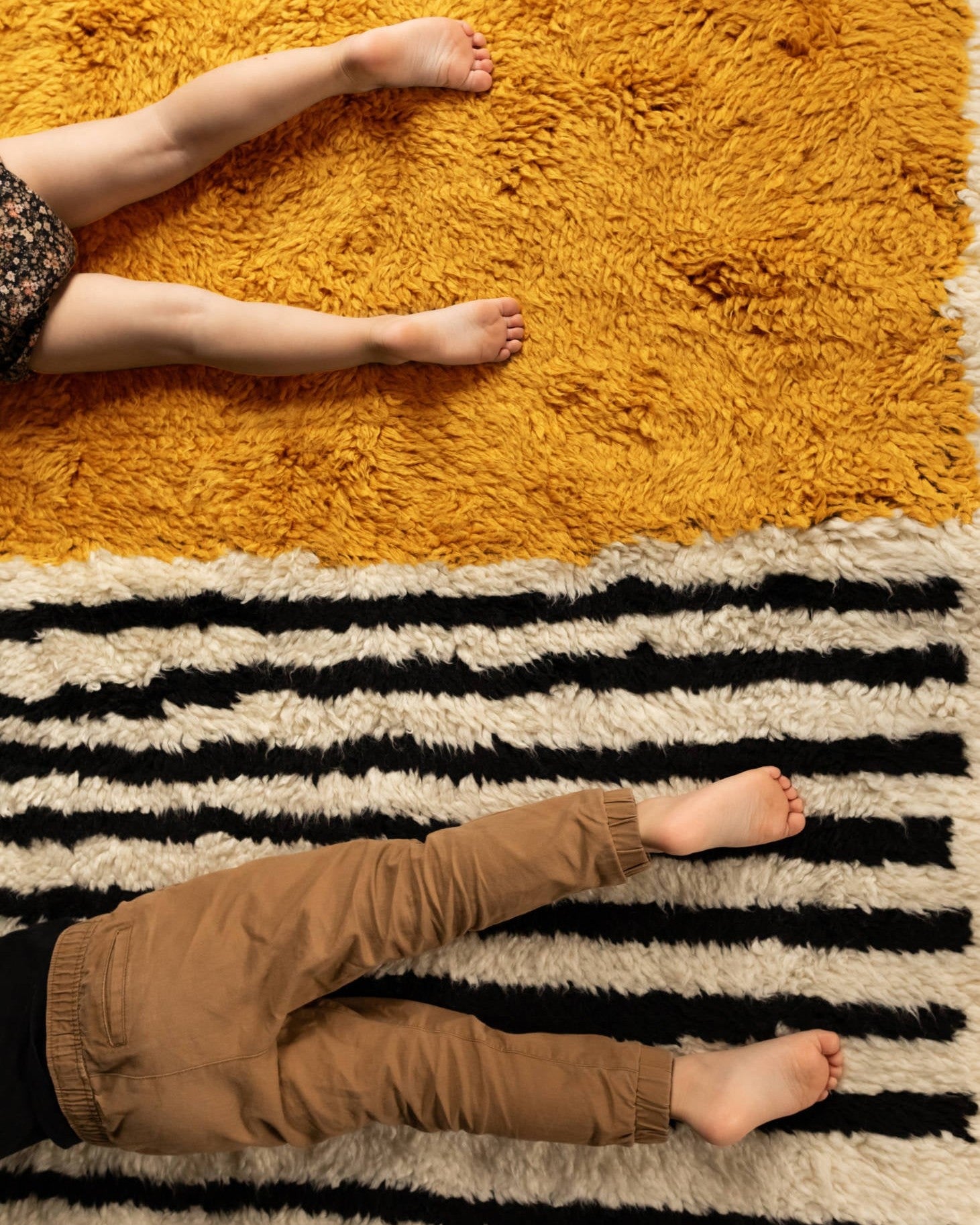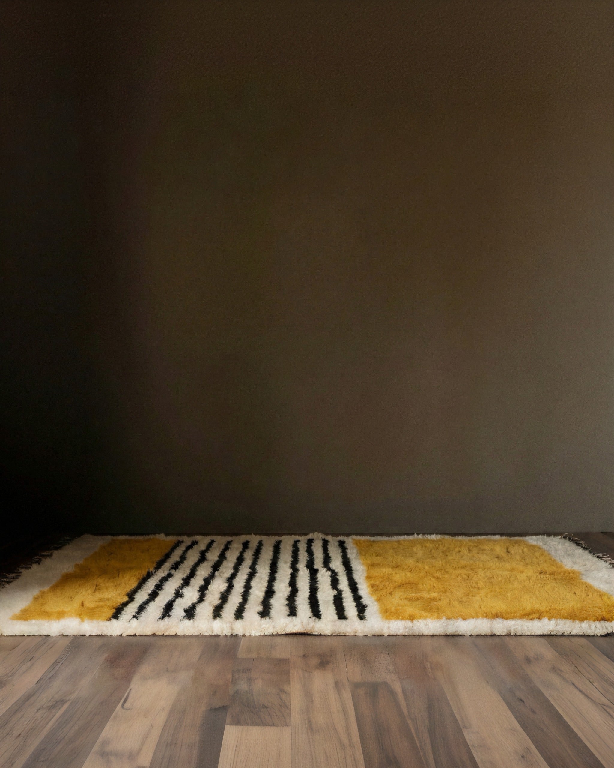 This isn’t just a rug; it’s the soul of the room. The ultra-thick wool shag texture invites you to lounge on the floor, making it a favorite spot for kids, pets, & adults alike. We love how the marigold section brings instant warmth to a space, while the unexpected mix of black and white stripes and adds a graphic, modern edge that keeps the look fresh.