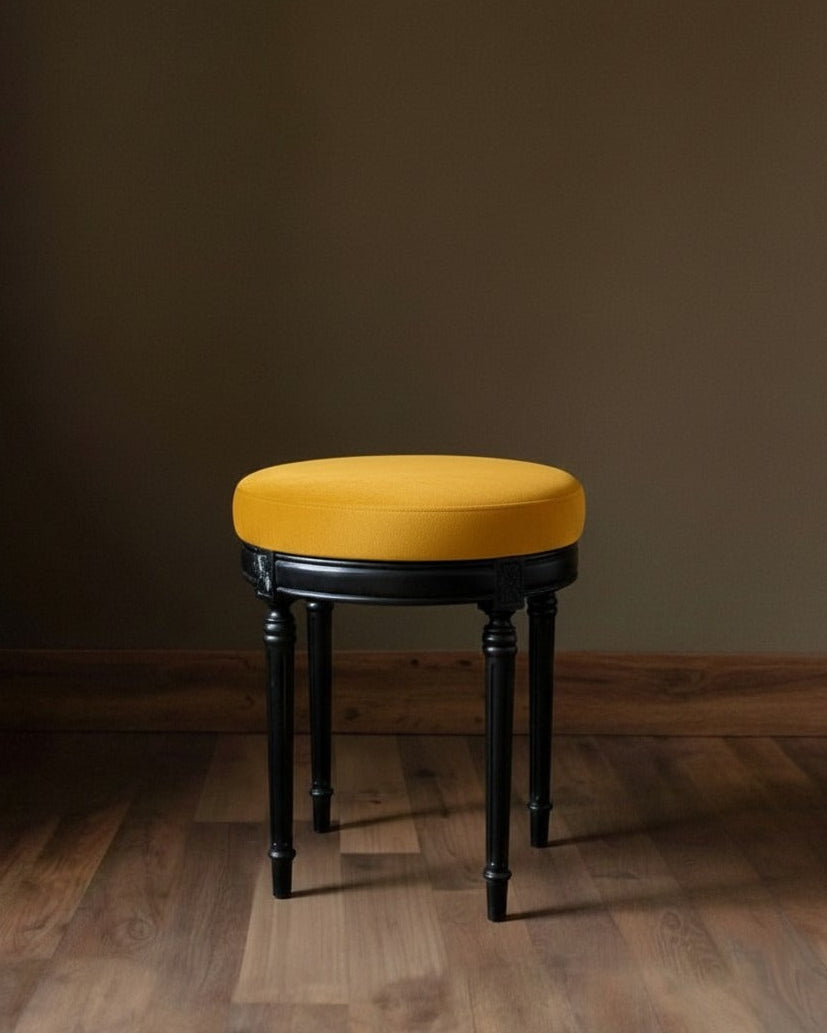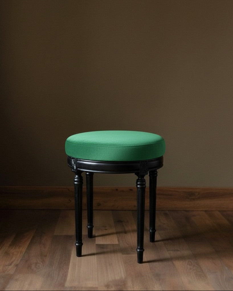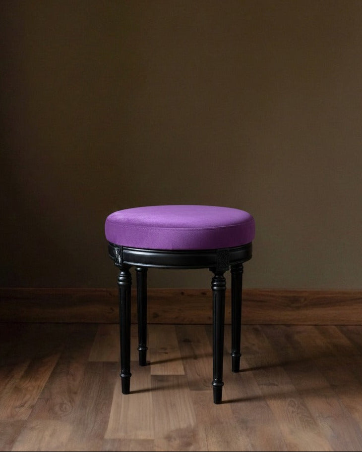 The stool features a plush, high-density foam cushion upholstered in premium, soft-touch velvet, offering a seat that is as comfortable as it is stylish. Supported by solid wood legs in a rich black finish, the silhouette boasts subtle turned detailing that adds a hint of classic sophistication to its clean lines.