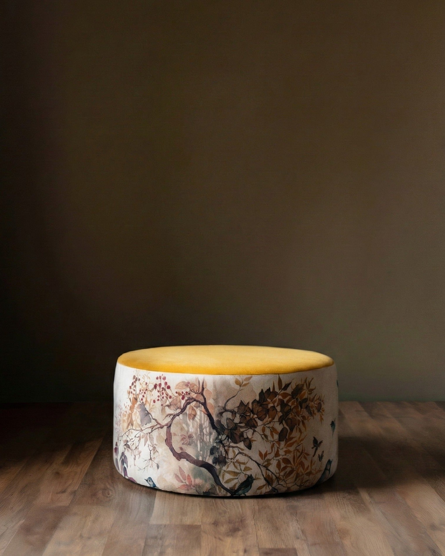 Introduce a touch of nature-inspired luxury to your living space with this exquisite round ottoman. The top is upholstered in a plush, sun-drenched yellow velvet, offering a vibrant pop of color and an incredibly soft, inviting texture. The sides feature a richly detailed botanical print, showcasing painterly branches, autumn leaves, berries, and perched birds in warm, earthy tones. This artisan-crafted stool serves as a stunning focal point, perfect as a chic footrest, a unique coffee table alternative, or elegant extra seating. Its versatile design and premium materials make it a sophisticated addition to any room.