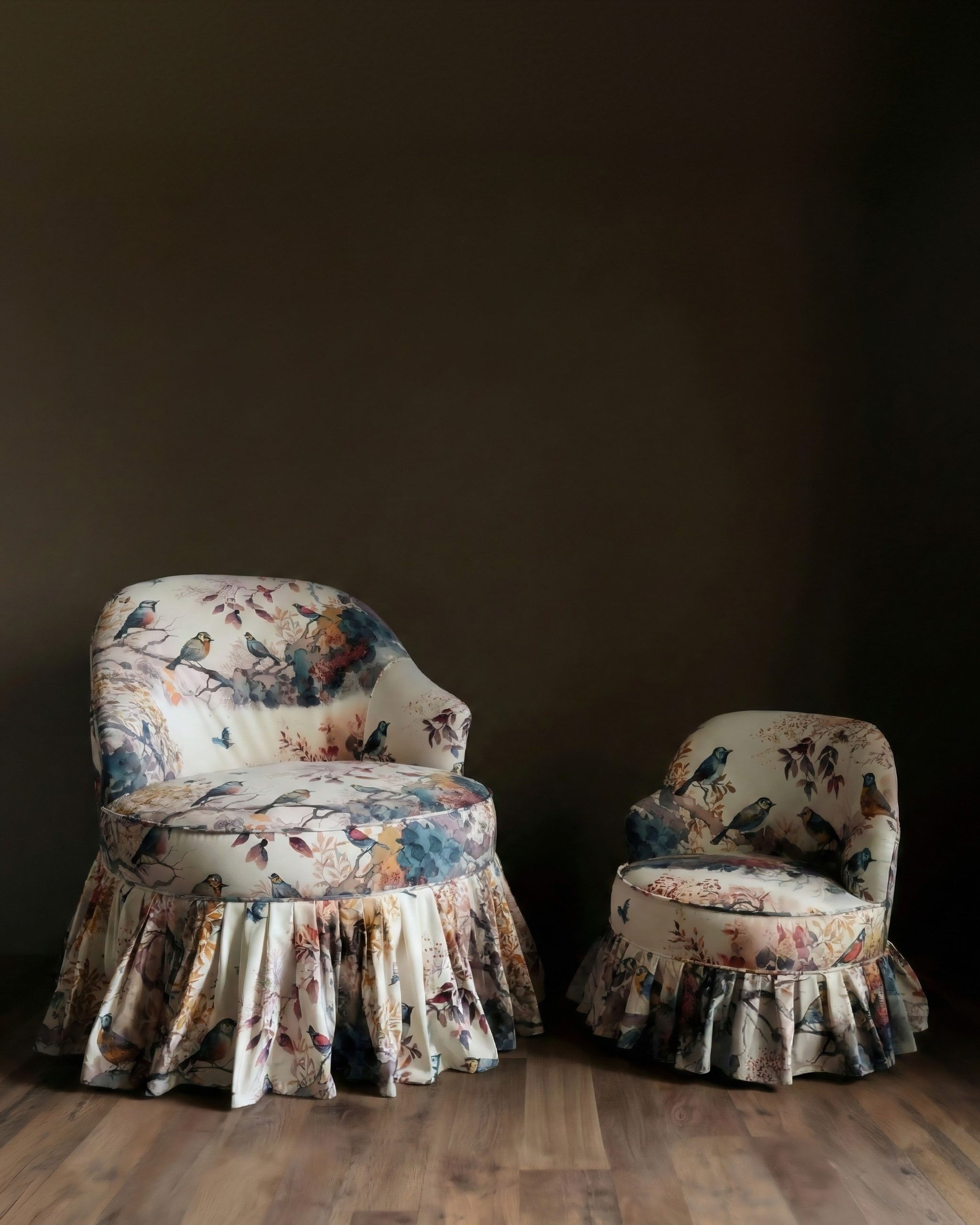 Introducing the Byrd Ruffle Velvet Chair, a truly enchanting piece that brings whimsical elegance and luxurious comfort to any room. Adorned with a delightful bird and botanical print, the Byrd sofa features plush velvet upholstery that is soft to the touch, ensuring a cozy & inviting experience. The vibrant pattern, showcasing a charming array of birds nestled amongst lush foliage and blossoms, creates a captivating focal point that will spark joy and conversation. A unique ruffled skirt adds a playful yet sophisticated detail, making the Florence sofa a perfect accent for a cozy reading nook, a sunlit conservatory, or a creatively styled living room.