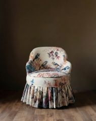Introducing the Byrd Ruffle Velvet Chair, a truly enchanting piece that brings whimsical elegance and luxurious comfort to any room. Adorned with a delightful bird and botanical print, the Byrd sofa features plush velvet upholstery that is soft to the touch, ensuring a cozy & inviting experience. The vibrant pattern, showcasing a charming array of birds nestled amongst lush foliage and blossoms, creates a captivating focal point that will spark joy and conversation. A unique ruffled skirt adds a playful yet sophisticated detail, making the Florence sofa a perfect accent for a cozy reading nook, a sunlit conservatory, or a creatively styled living room.