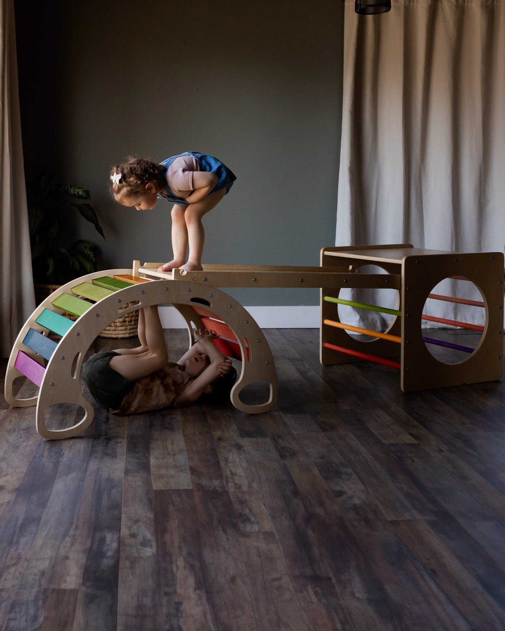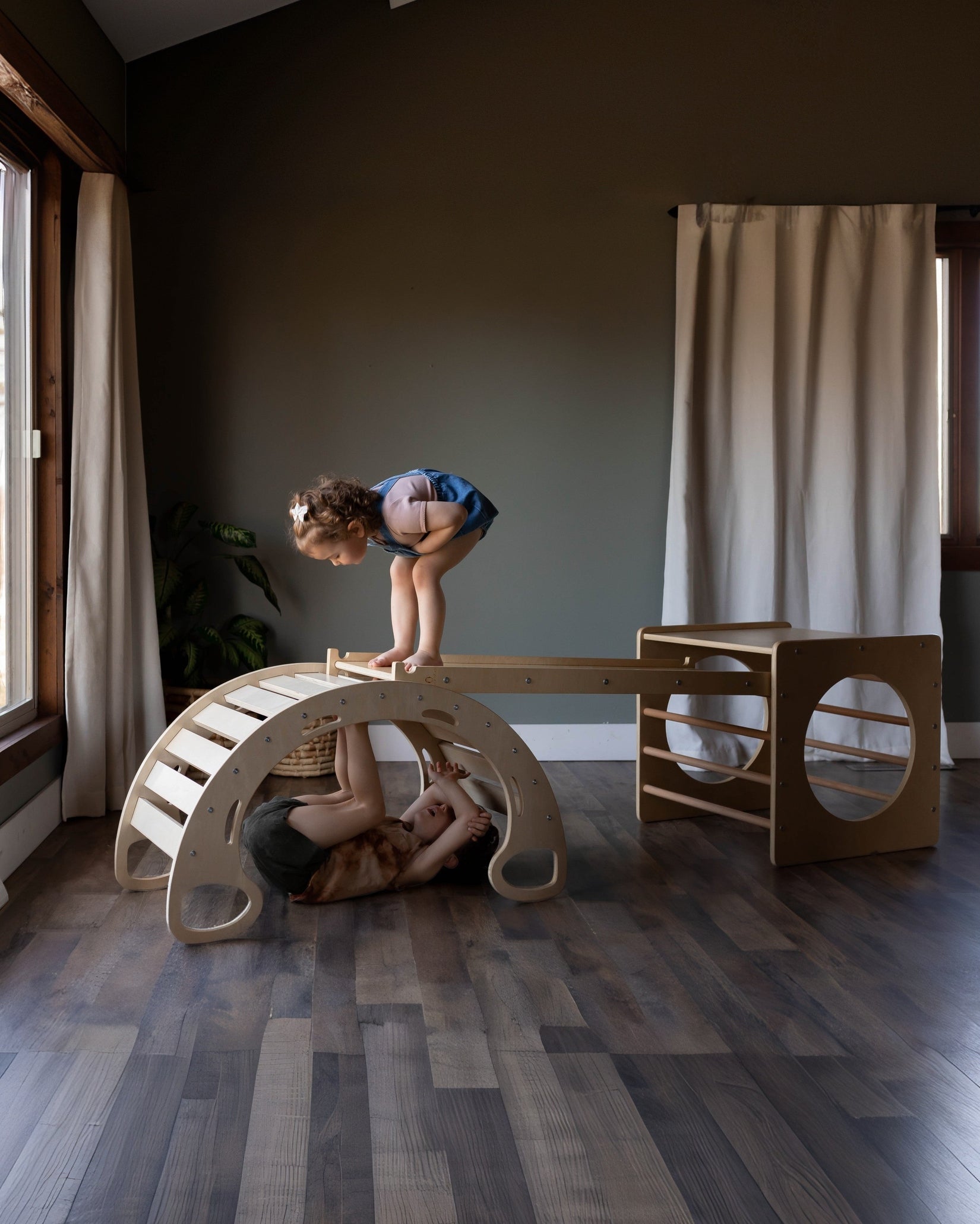 Rainy or chilly days need not mean increased screen time. Invite imaginative and active play indoors with this elegant playset designed for toddlers and preschoolers. Featuring a jumbo Waldorf rocker, reversible slide, and a spacious play cube, it offers endless opportunities for climbing, sliding, and balancing within the safety of your home. Connect the slide between the rocker and cube to form an exciting bridge, or use the pieces separately for varied play experiences. This refined set promises hours of engaging fun, day after day.