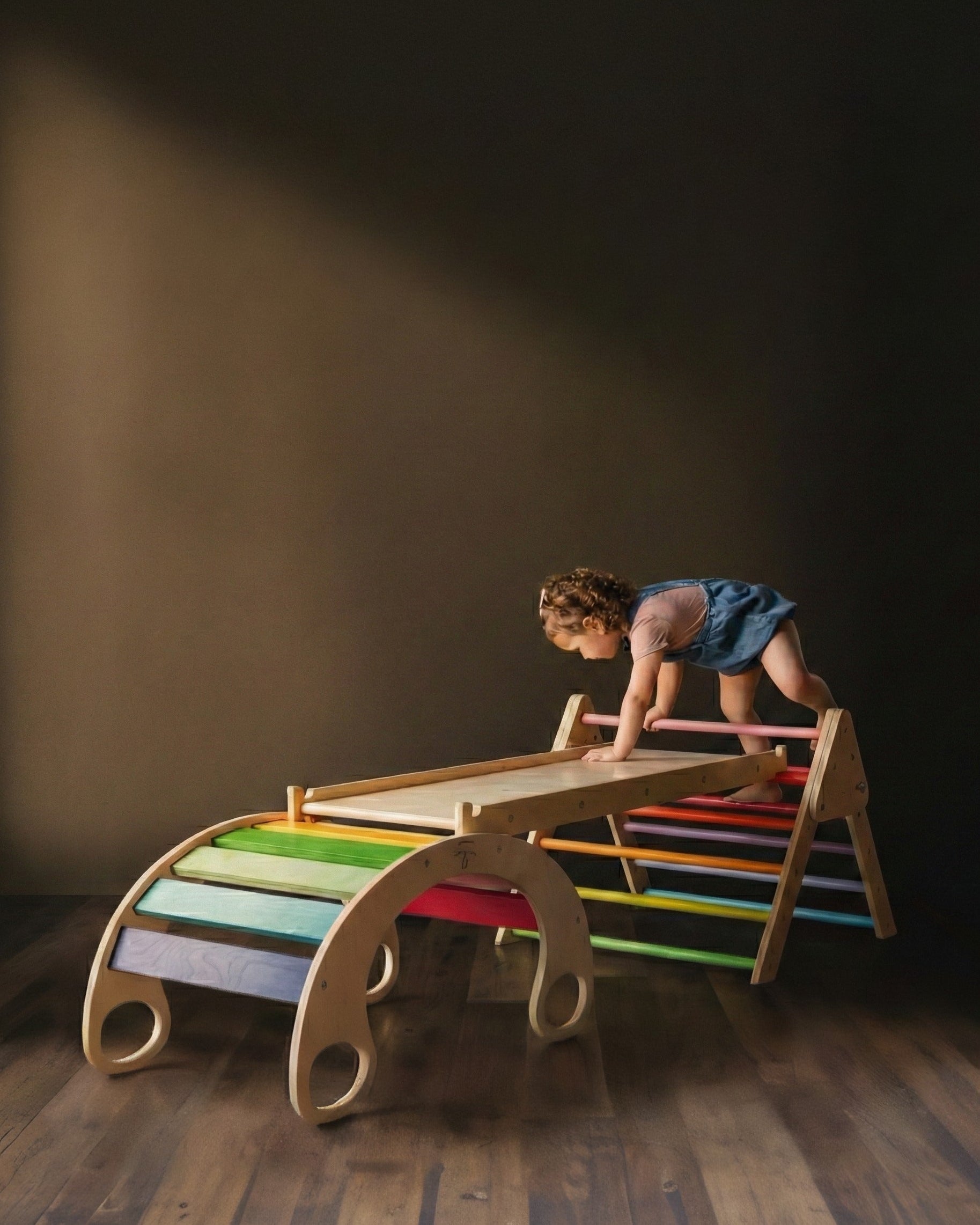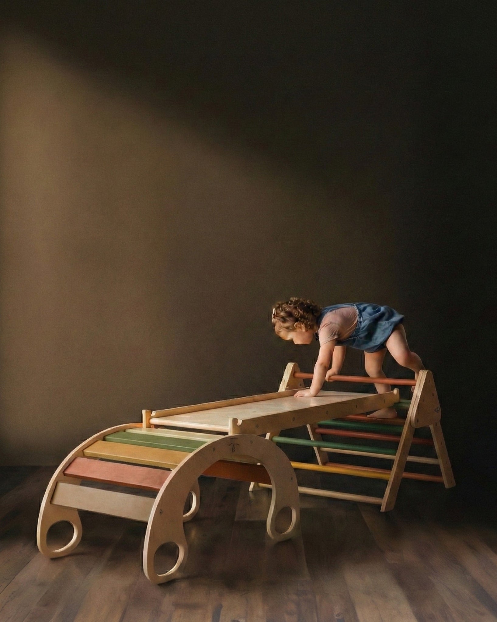 Create limitless indoor adventures with the small Waldorf Playset, a thoughtfully designed three-piece ensemble. This set features a compact foldable climbing triangle, a small Waldorf rocker, and a versatile reversible rock climbing ramp—ideal for active toddlers and preschoolers. While your little ones climb, hang, jump, rock, and slide safely within their playroom, you can savor a peaceful morning coffee, perhaps even a second. The playset encourages imaginative exploration, allowing children to assemble towers and bridges or embark on journeys to triangle-shaped islands. Inspire boundless creativity and extended playtime with this elegant indoor solution.