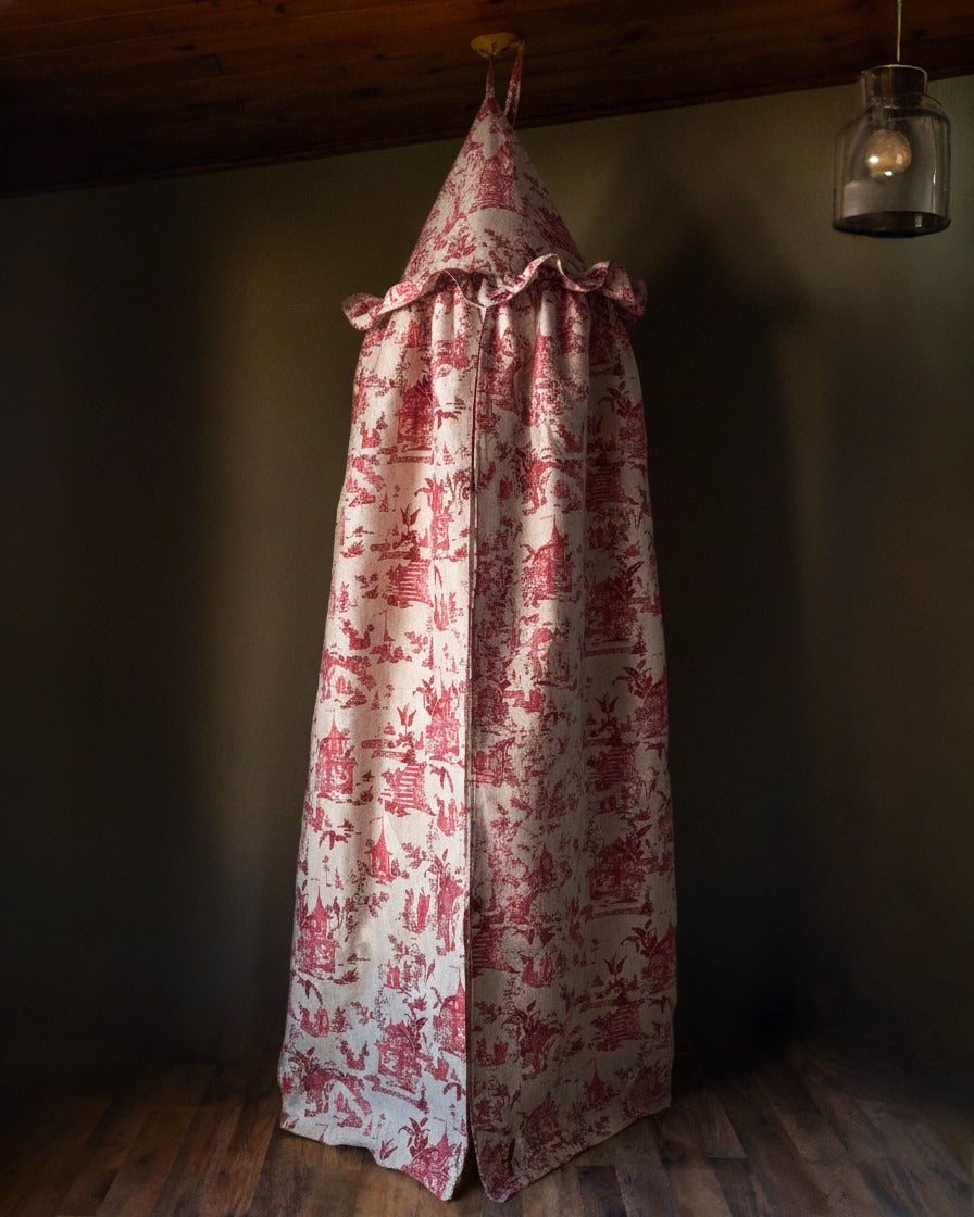 The Clemence canopy is a celebration of vintage artistry and natural comfort. Crafted from premium, breathable linen, this hanging canopy features a captivating red and burgundy toile print that brings scenes of pastoral beauty and chinoiserie architecture to life.