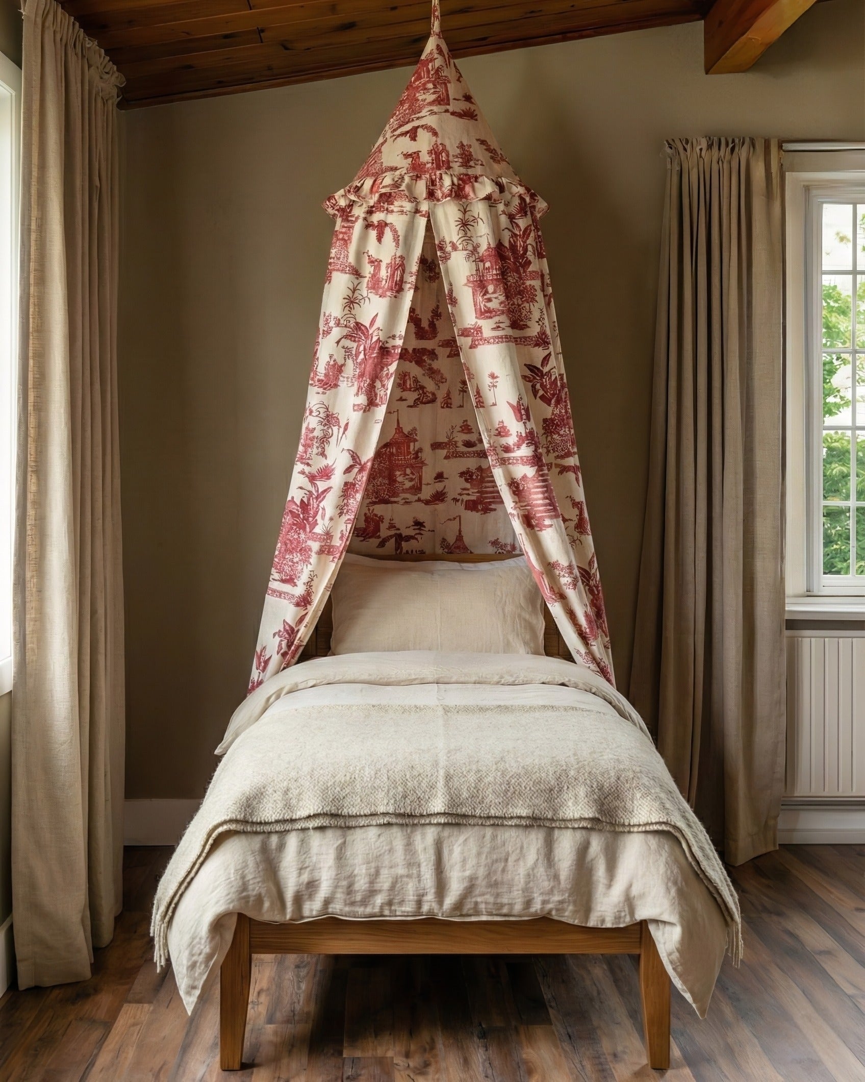 The natural texture of the linen softens the intricate illustrations, creating a look that is both sophisticated and inviting. Whether suspended over a single bed to create a dreamy sleeping nook or hung in a corner to craft a secret reading hideaway, “Le Moulin” adds a focal point of heritage charm to any space.