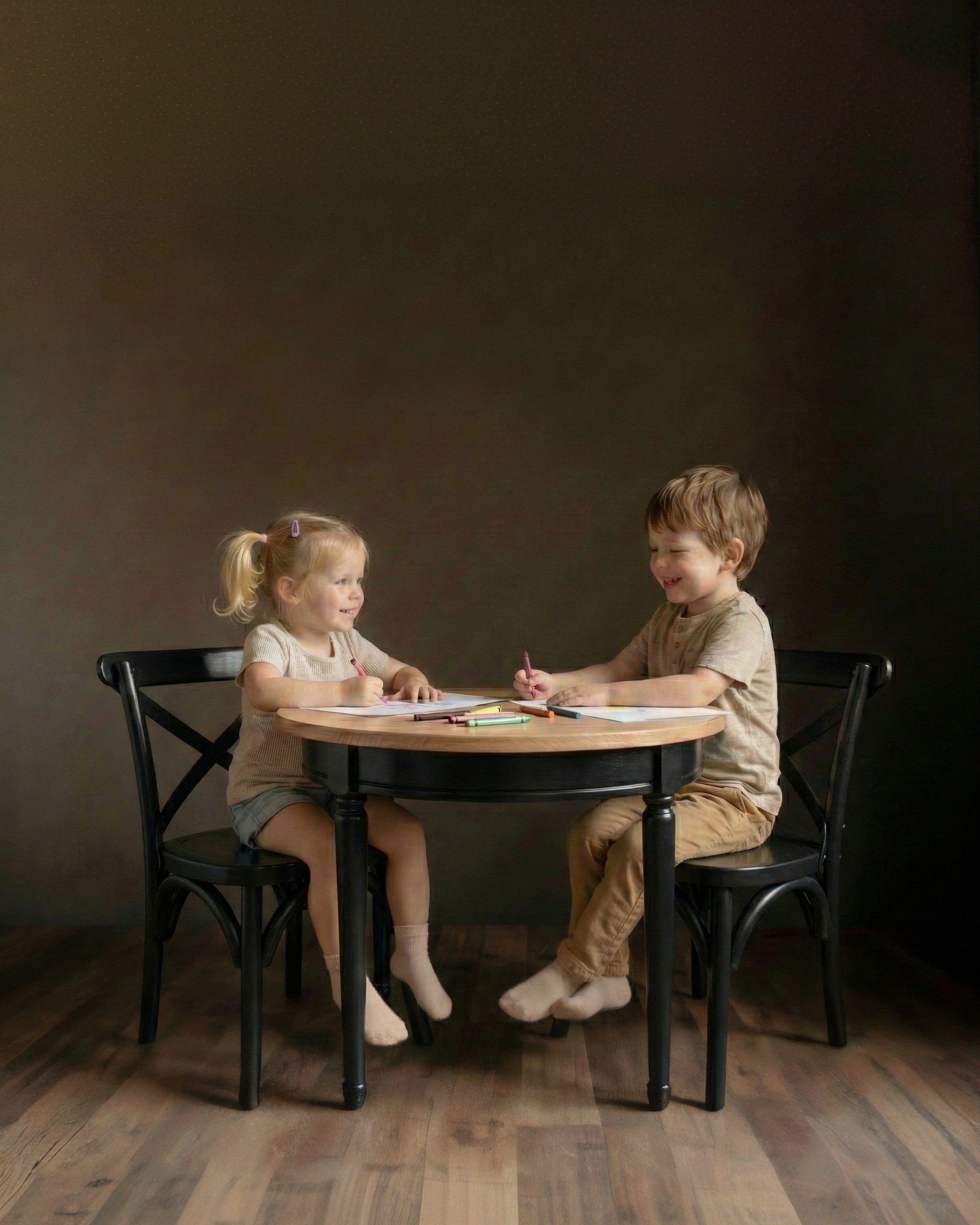 Elevate your child’s play space with the exquisite Genevieve Play Table & Chair Set. Crafted from high-end French oak, this set combines timeless elegance with heirloom-quality durability. The classic French cross-back chairs and a beautifully turned pedestal table create a sophisticated yet inviting spot for tea parties, crafts, and creative play.