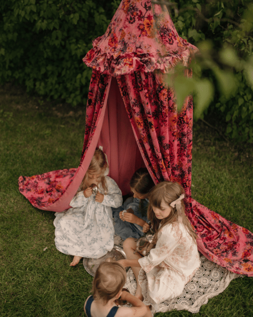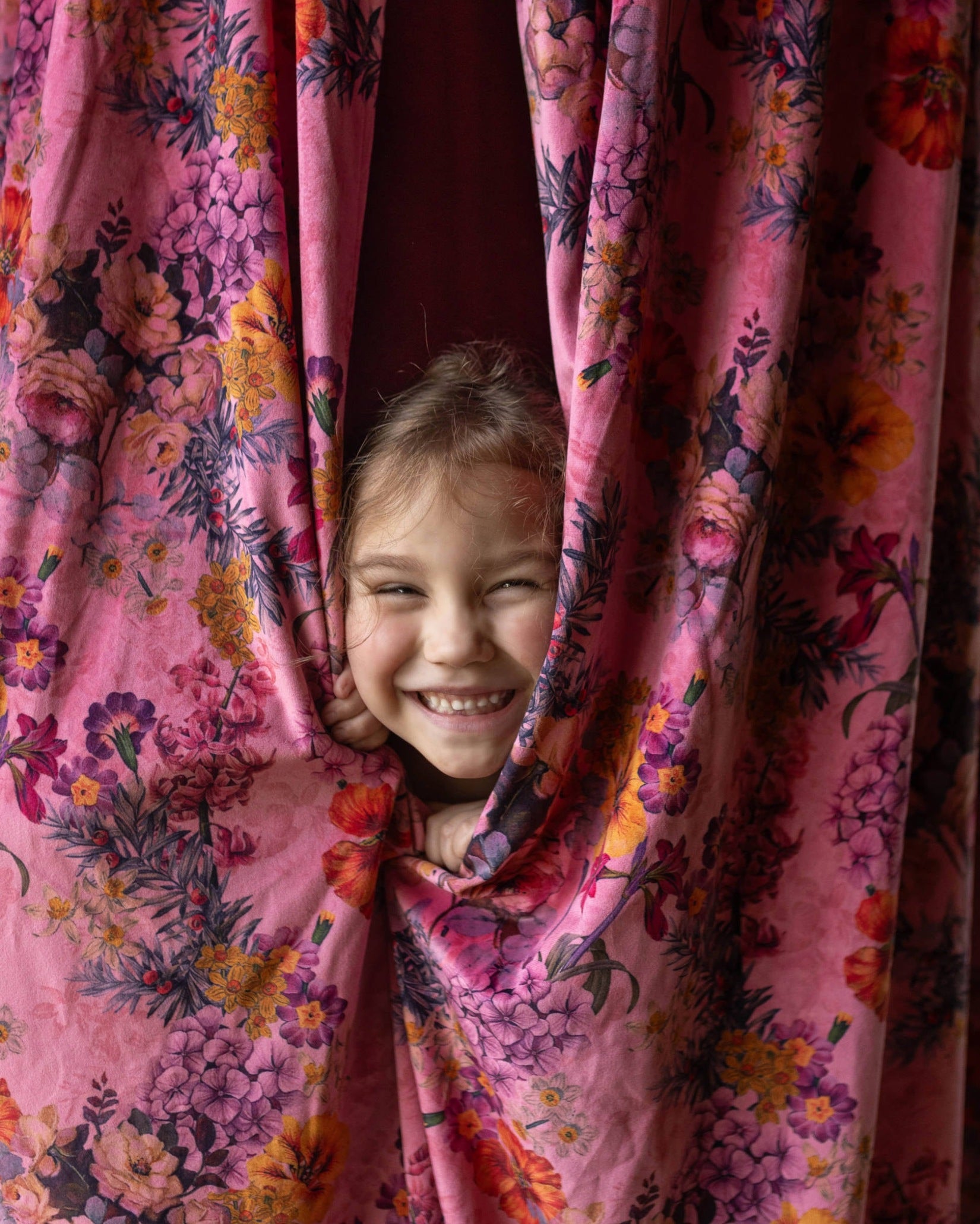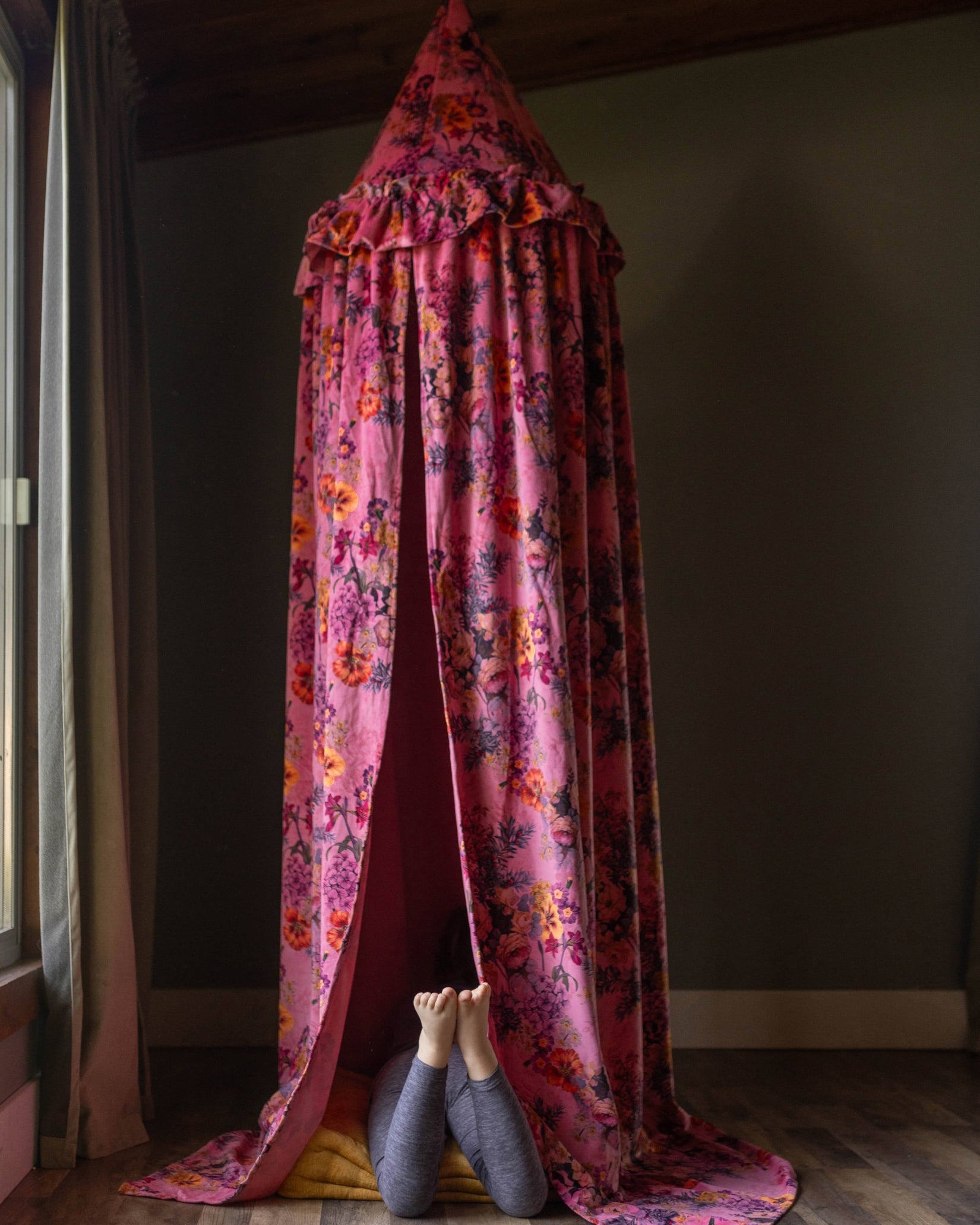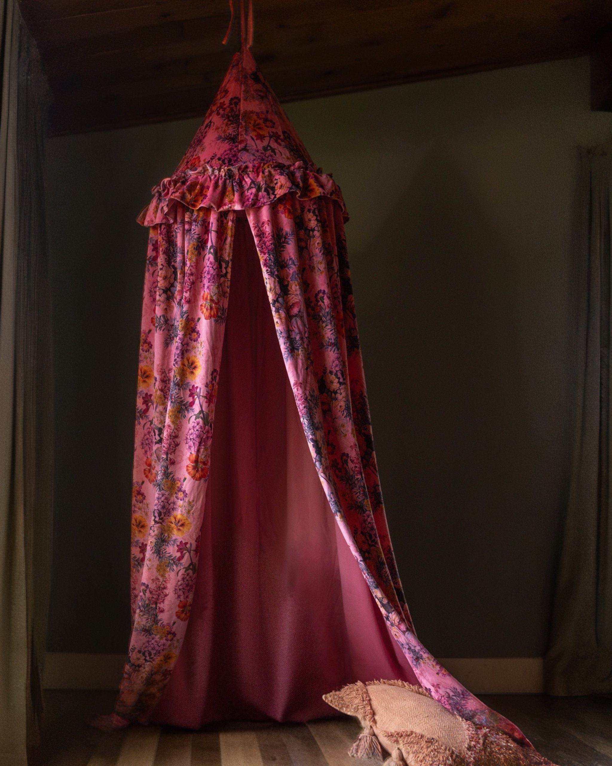 Every child needs a magical hideaway to call their own. Transform any corner of the nursery or playroom into an enchanting escape with this lush, pink floral canopy. Crafted from soft, rich velvet that feels as cozy as it looks, this hanging tent features a vibrant riot of vintage-inspired blooms in shades of deep orange, purple, and gold.