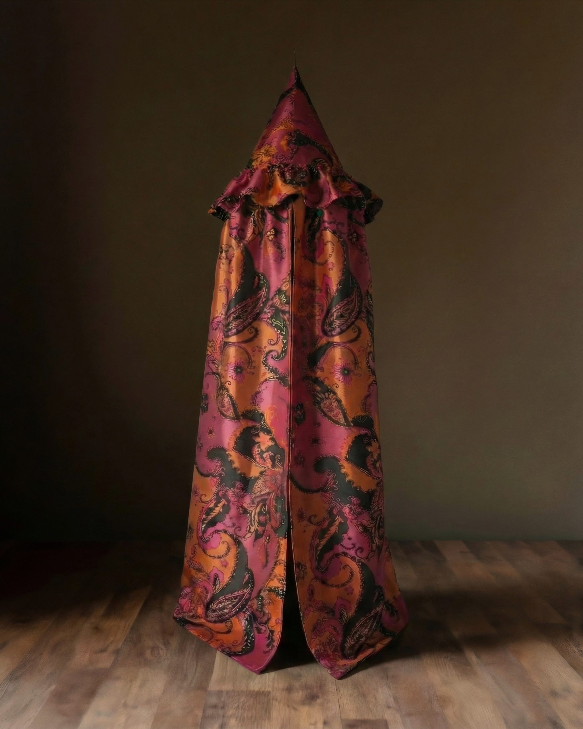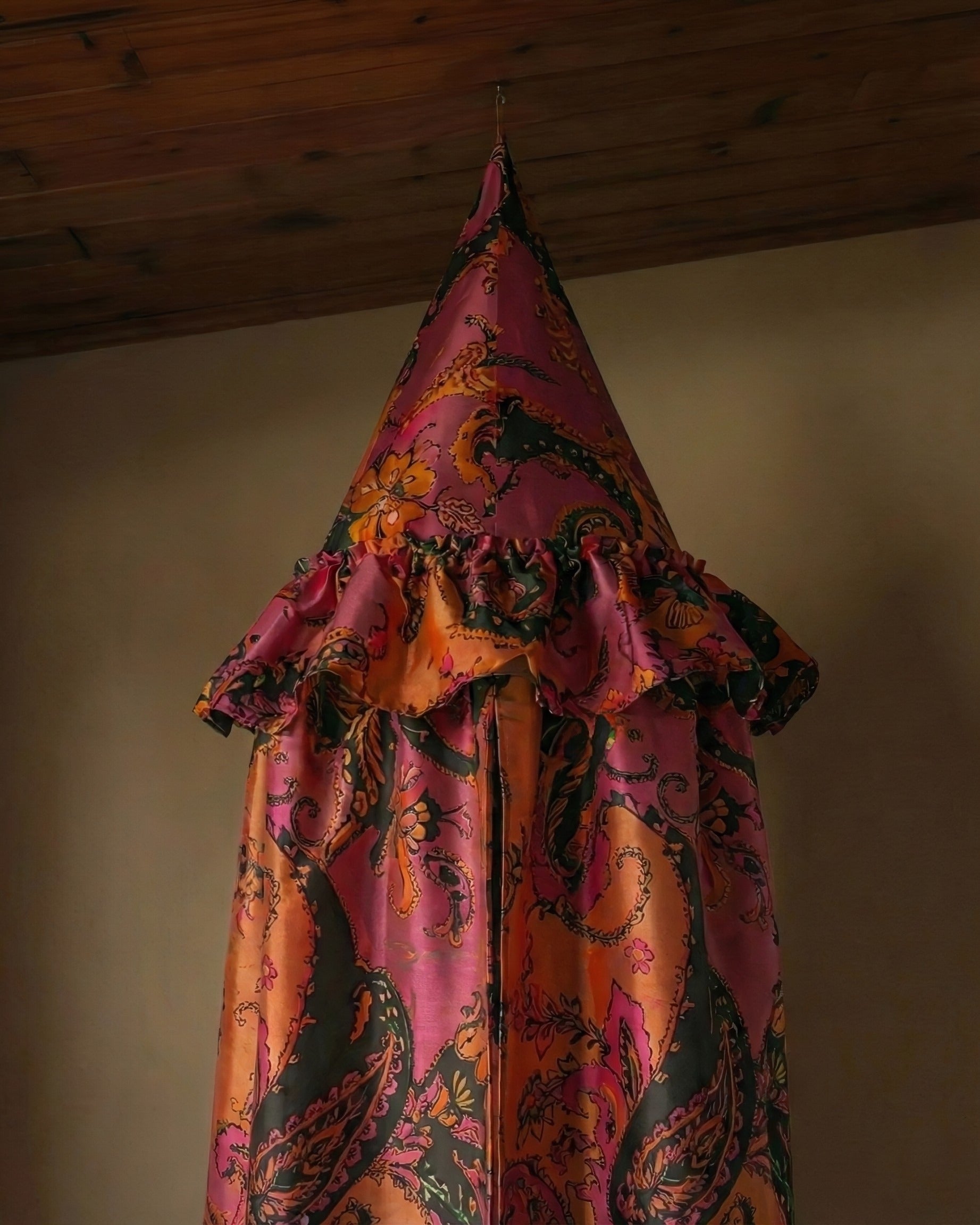 Transform any corner into a palace of dreams with the exquisite Mabel Silk Canopy. Designed to be the crowning jewel of your little one’s room, this canopy captures the magic of a sunset with its vibrant palette of hot pinks, deep oranges, & intricate paisley motifs.