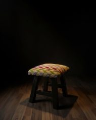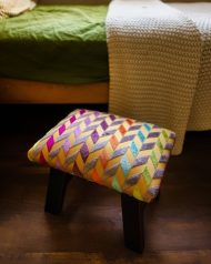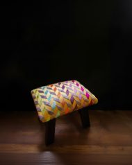 Elevate your living space with this exquisite handcrafted stool, a perfect blend of rustic durability and opulent textile design. The seat is upholstered in high-end French velvet, boasting a sumptuous pile that feels as luxurious as it looks. The vibrant, multicolored chevron pattern offers a tapestry of jewel tones designed to catch the eye. This plush top rests upon a robust, dark-finished wooden base, constructed with longevity in mind. It’s more than just a footstool; it’s a statement piece of functional art ready to add warmth and sophisticated bohemian charm to any corner of your home.